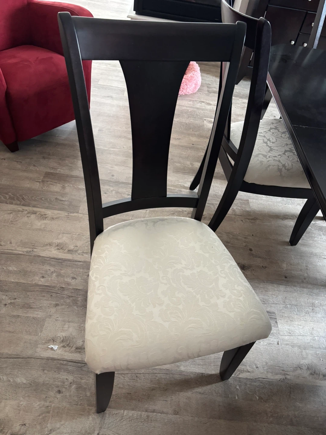 A dark brown china cabinet with glass doors and drawers. It's paired with a matching dining table and chairs featuring upholstered seats. This set offers ample storage and seating for your dining room.