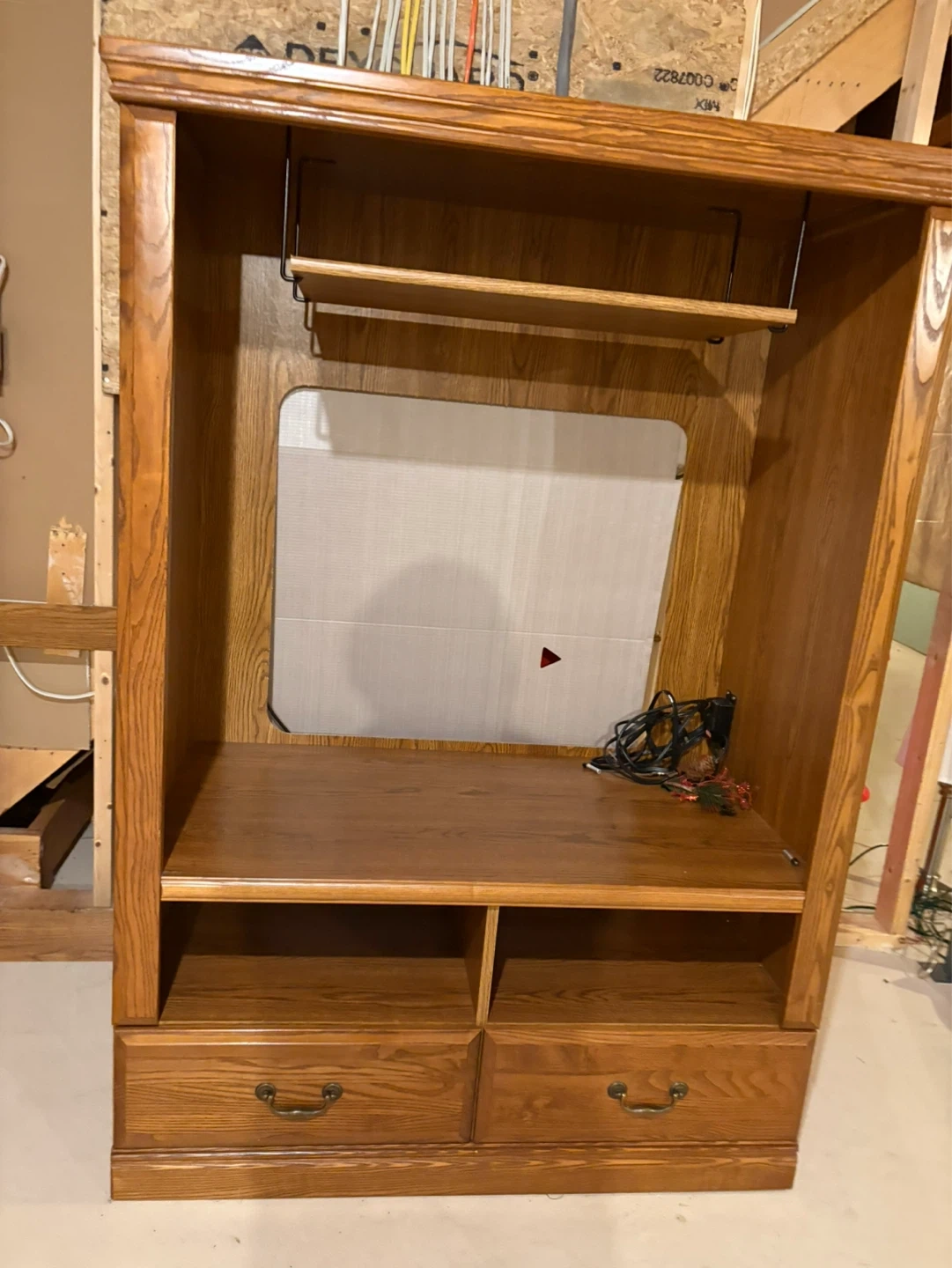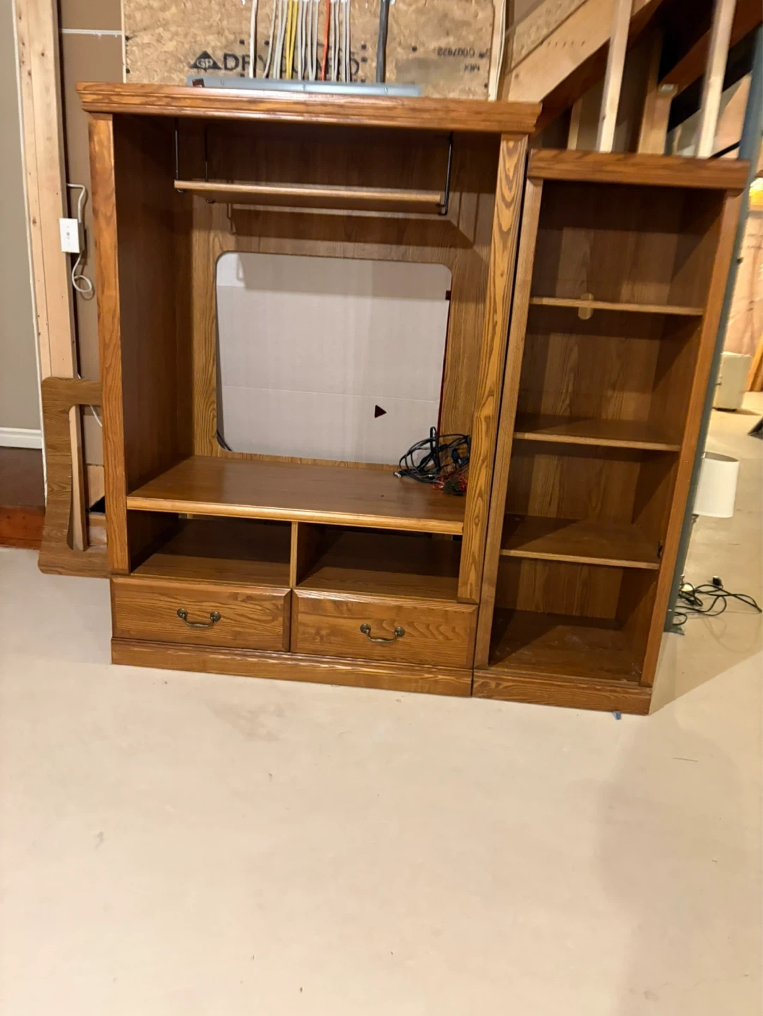 A sturdy wooden entertainment unit with ample storage, featuring two drawers and multiple shelves. It includes a hanging rod for clothes or media components. This versatile piece would work well as a TV stand or display cabinet.