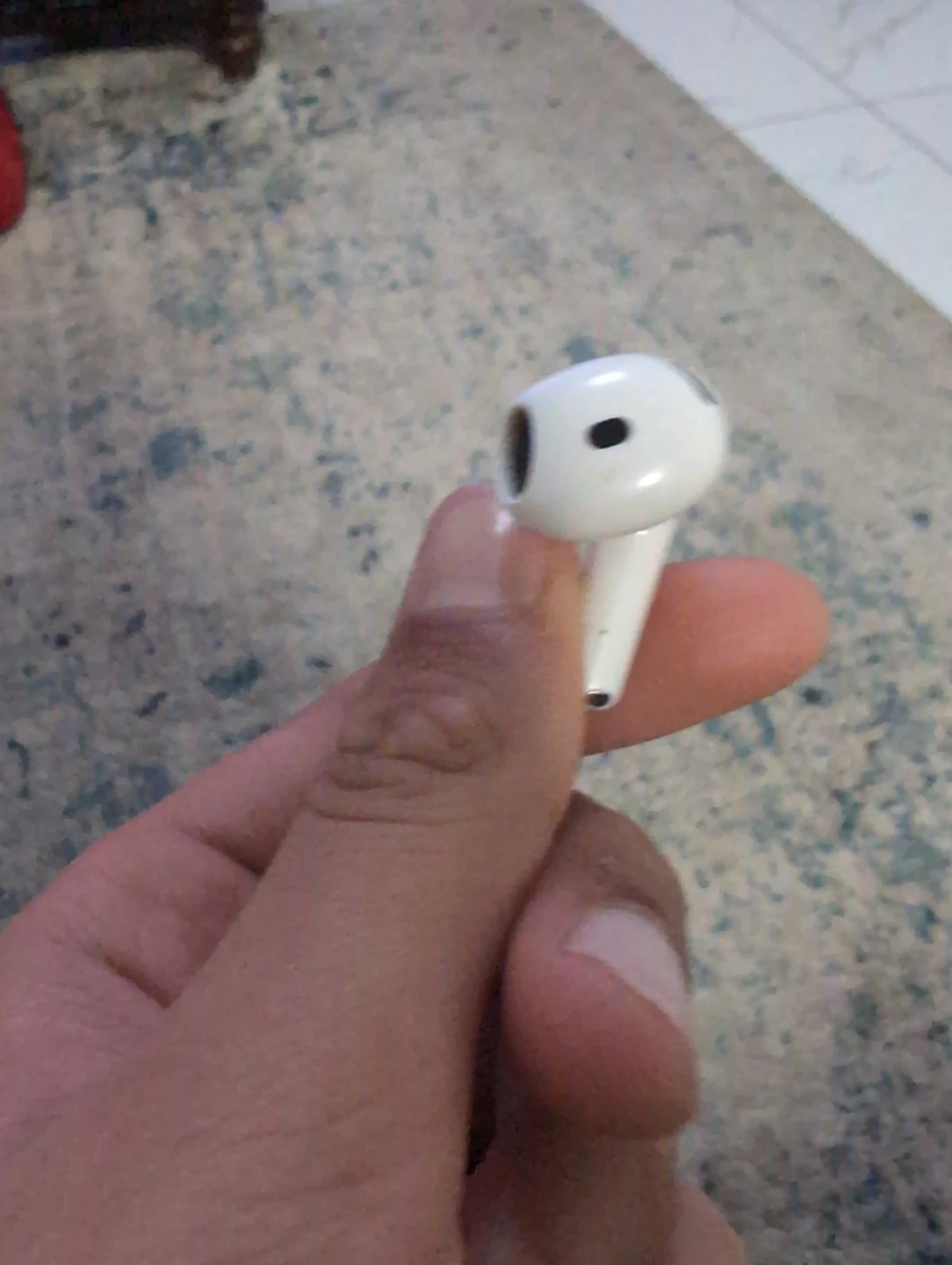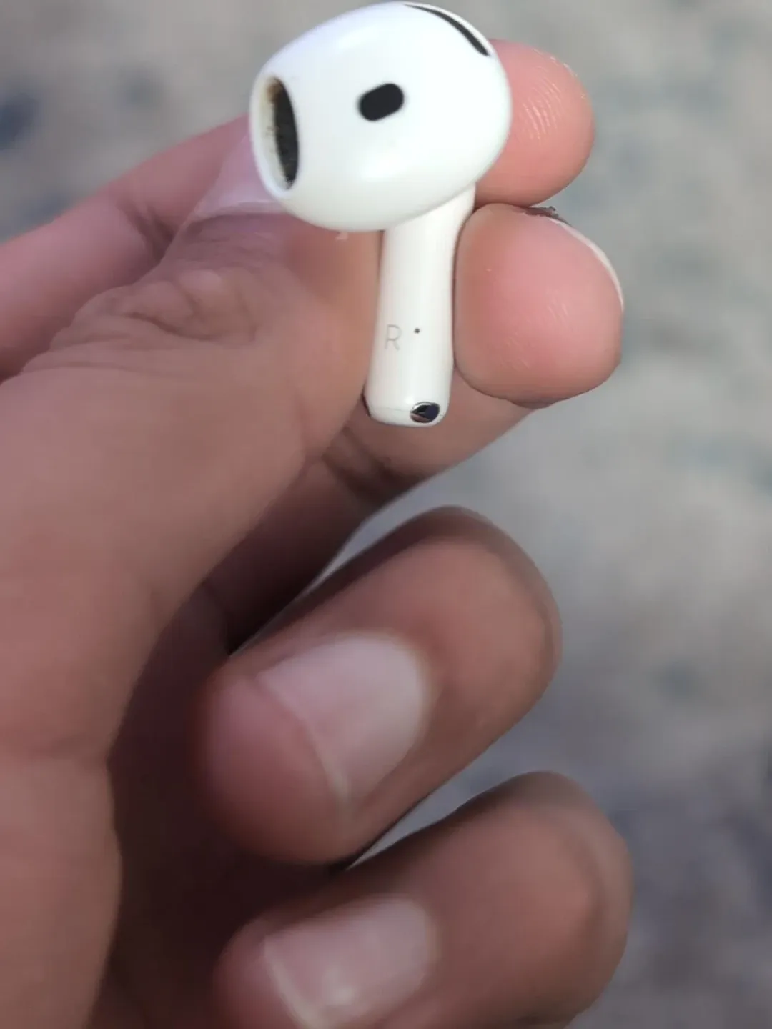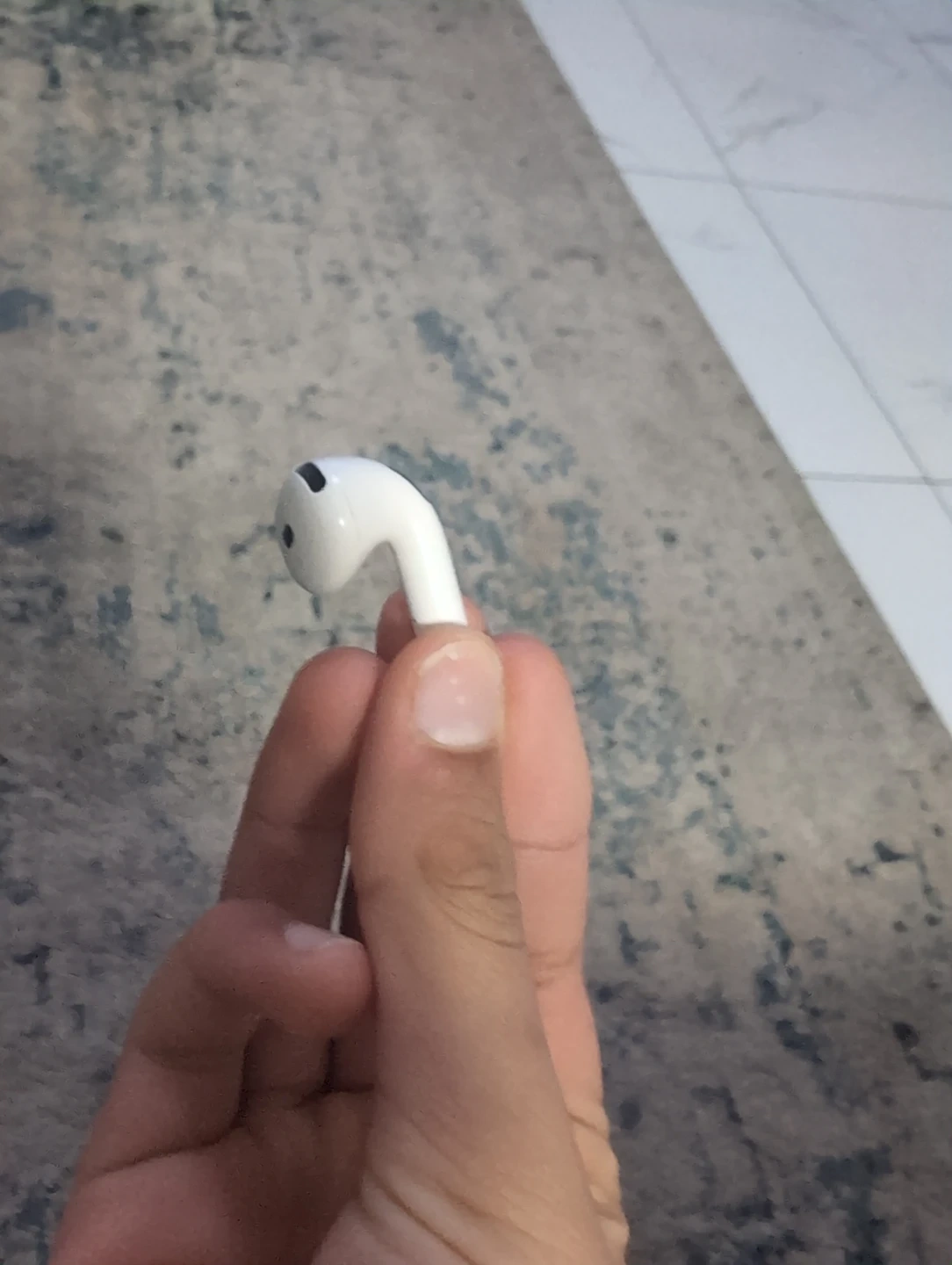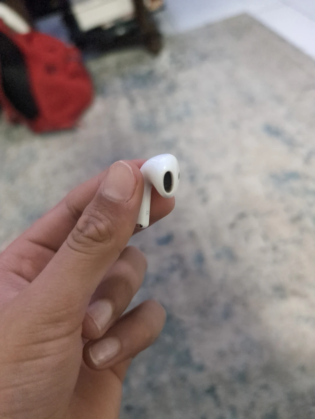 Single white Apple AirPods Pro right earbud. It's a wireless in-ear headphone. The earbud is white plastic.