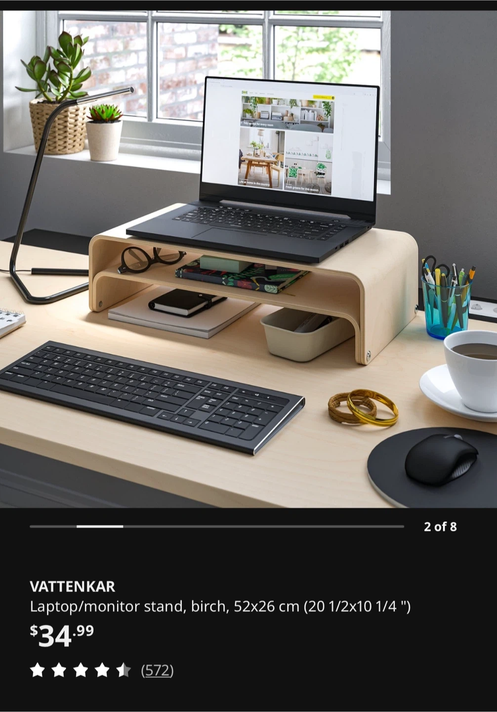 This VATTENKAR laptop/monitor stand is made of birch. It measures 52x26 cm (20 1/2x10 1/4 "). This stand helps elevate your screen for better ergonomics.