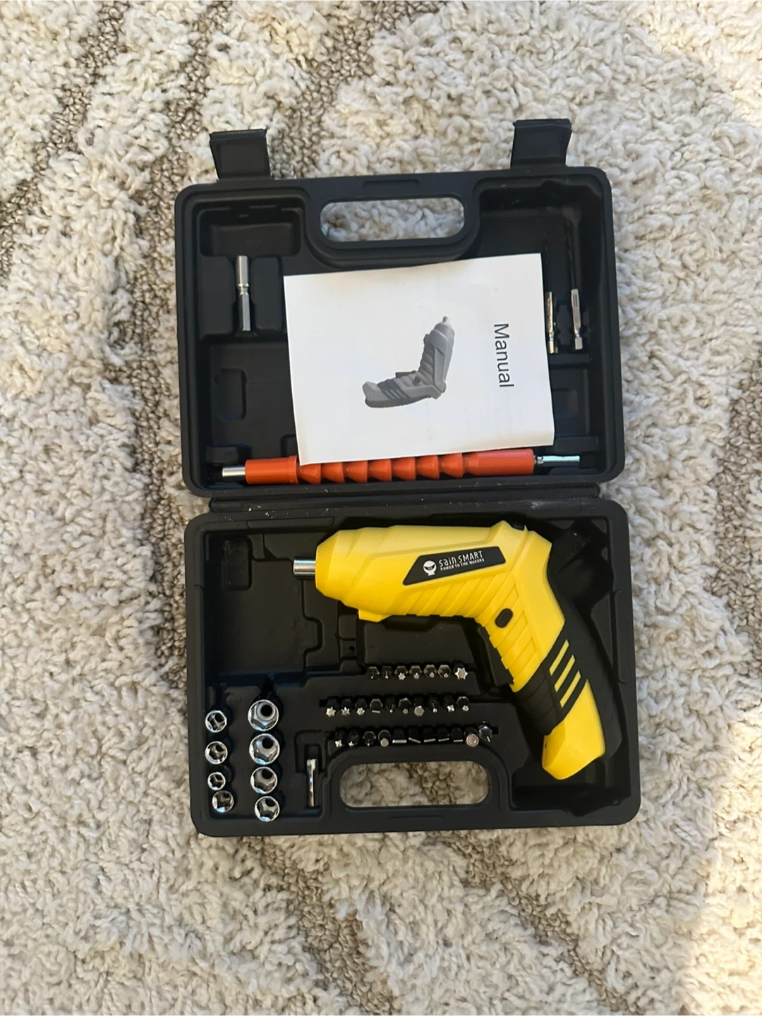 This is a Sain Smart cordless electric screwdriver set. It's yellow with black accents. The kit includes the screwdriver and various bits and sockets in a black carrying case.