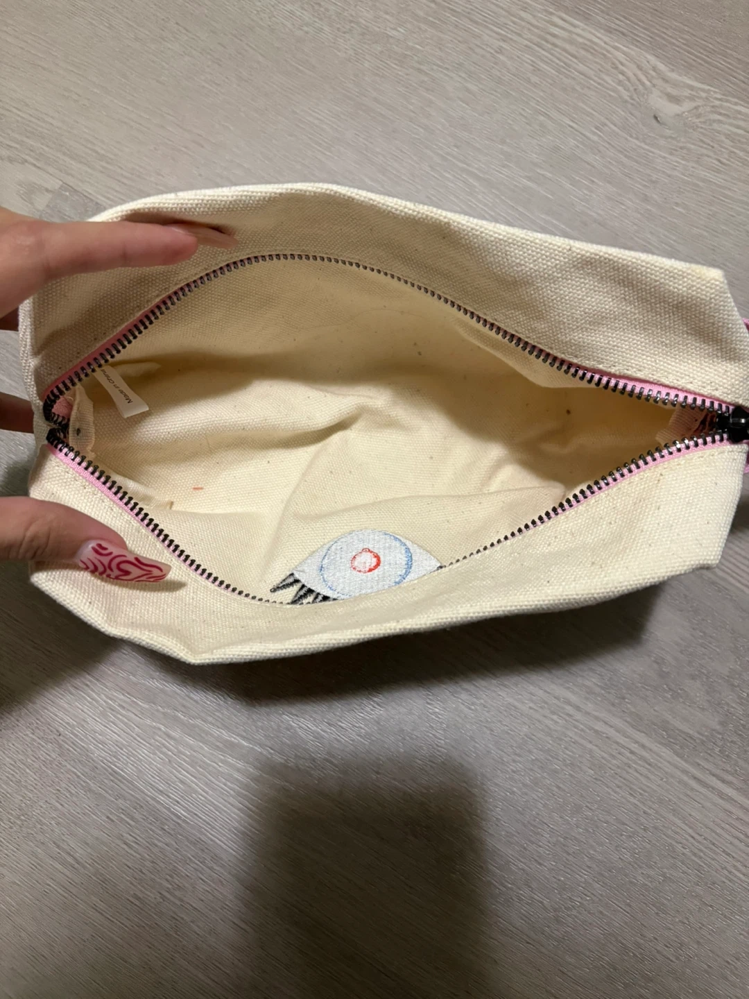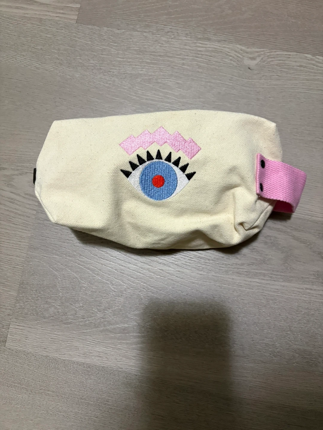 This cream-coloured canvas cosmetic bag features a fun embroidered eye design. It's perfect for storing makeup and toiletries.