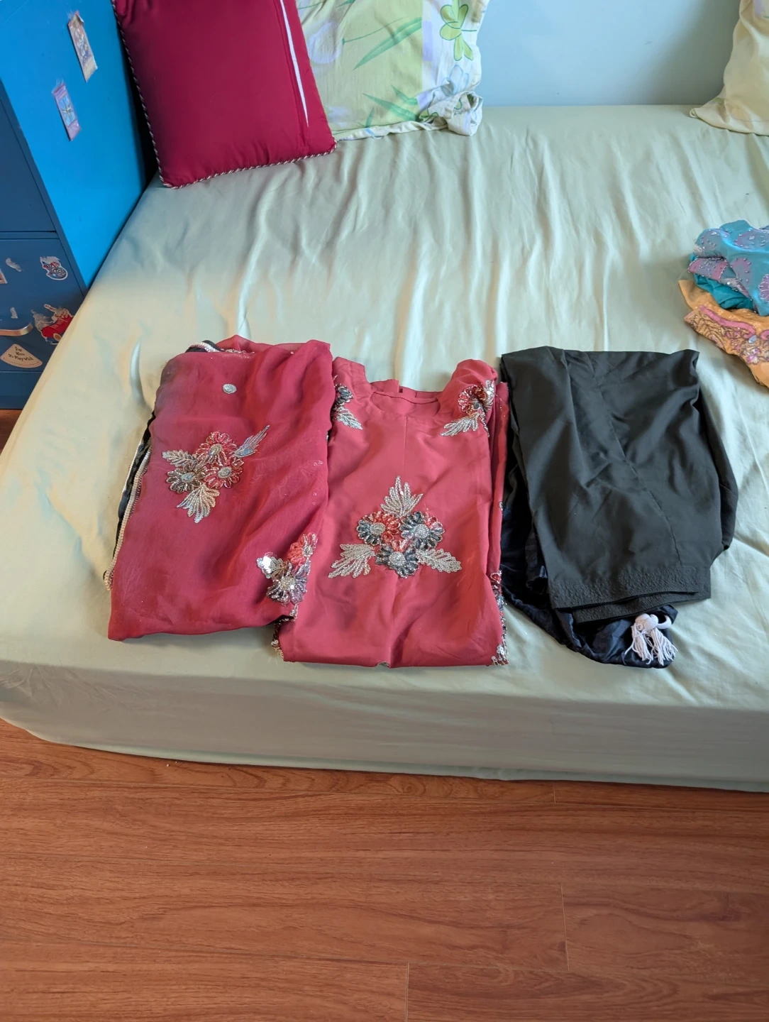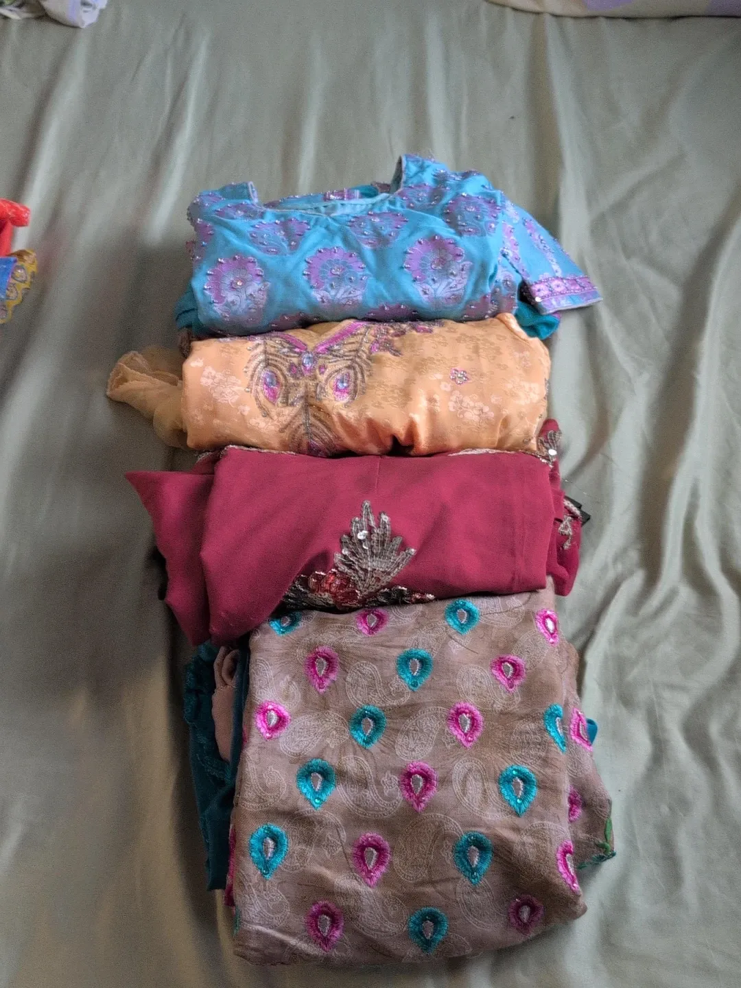 Set of three Punjabi suits with intricate embroidery. Includes tops, bottoms, and dupattas. Beautiful colours and designs!