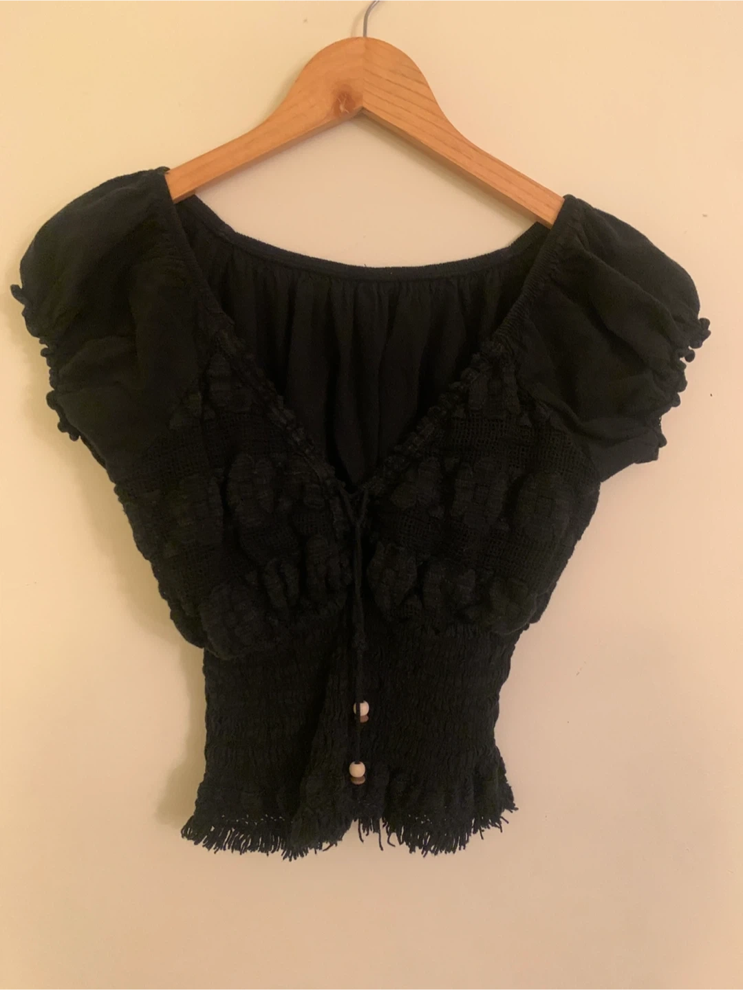 Here's a cute black crop top! It features a smocked design and short sleeves. Perfect for a casual outing or dressing up for a night out