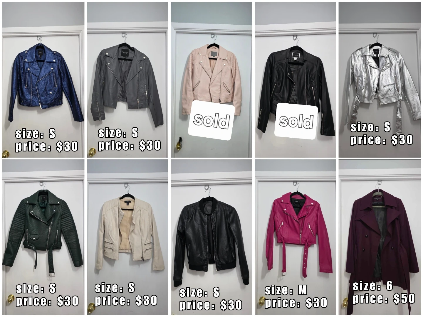 A collection of faux leather jackets. Includes sizes S and M in colours like blue, grey, silver, green, cream, black, pink, and burgundy. Most are size S, with one size M and one size 6 available.
