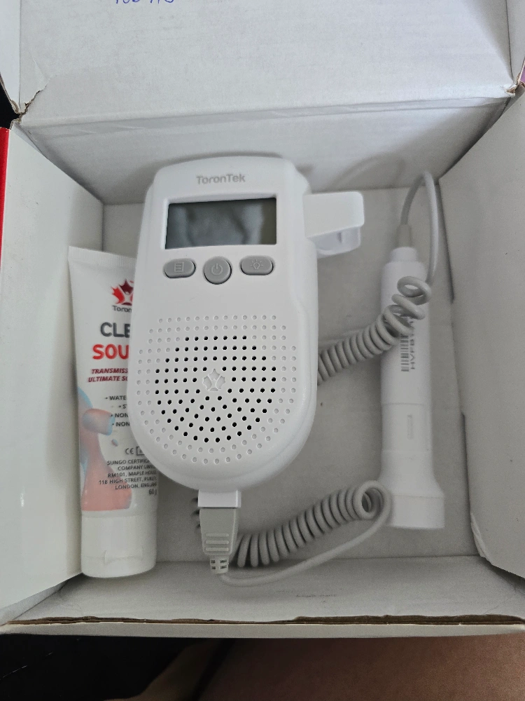 Used fetal doppler. Includes device, probe, and ultrasound gel. Excellent condition. Listen to baby's heartbeat.