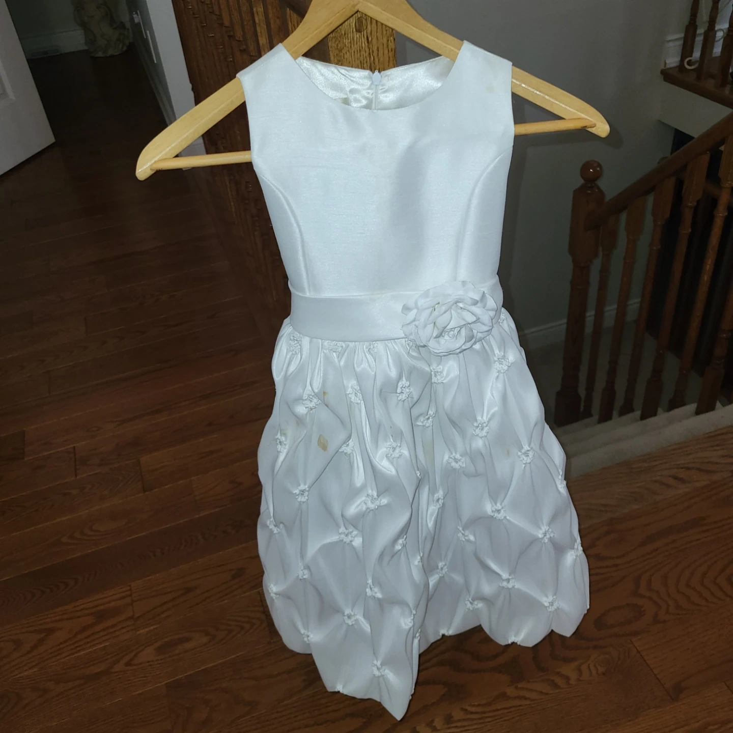 Beautiful white polyester dress with a satin sash and floral accents. It features a layered skirt with a delicate tulle underskirt.