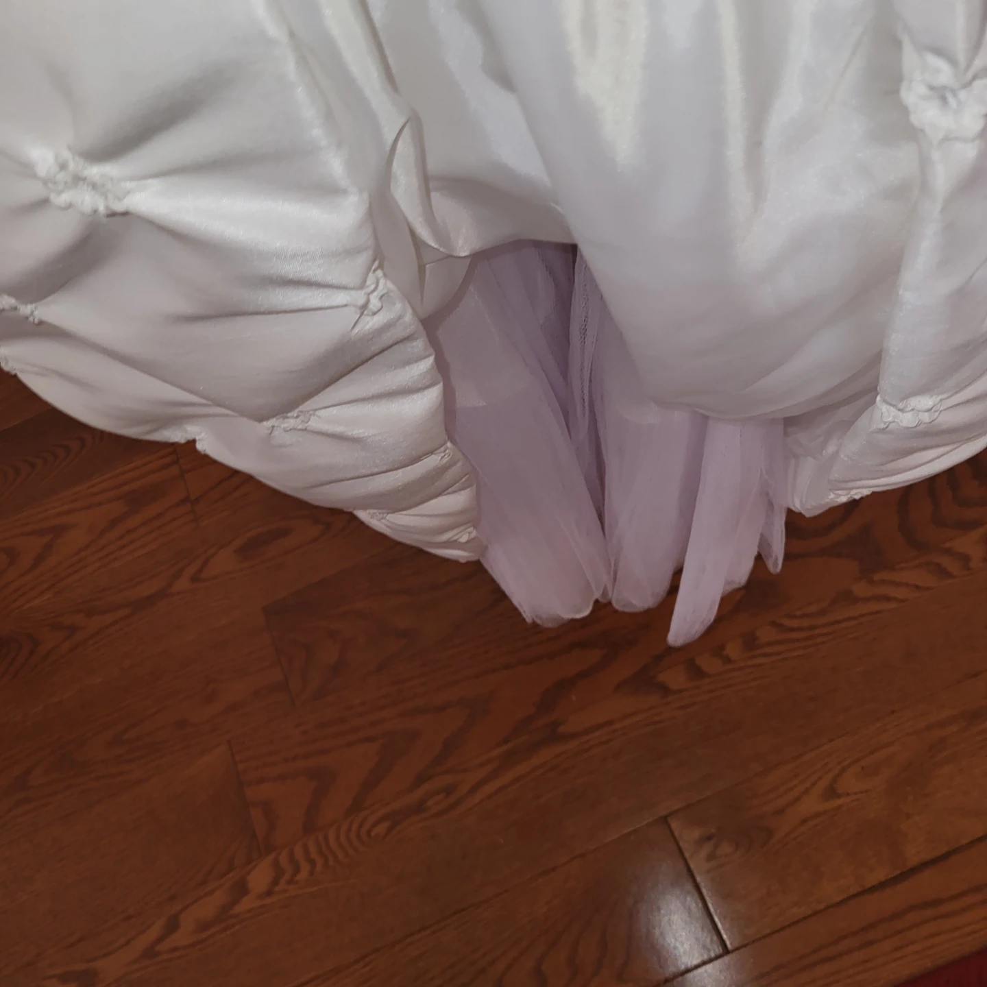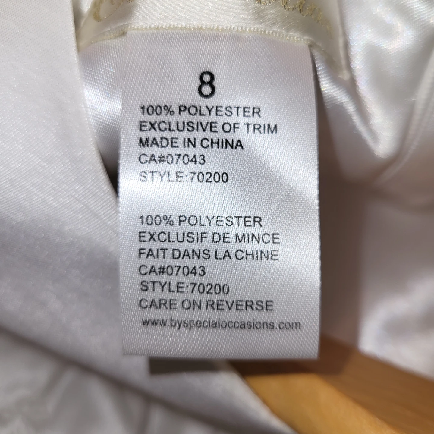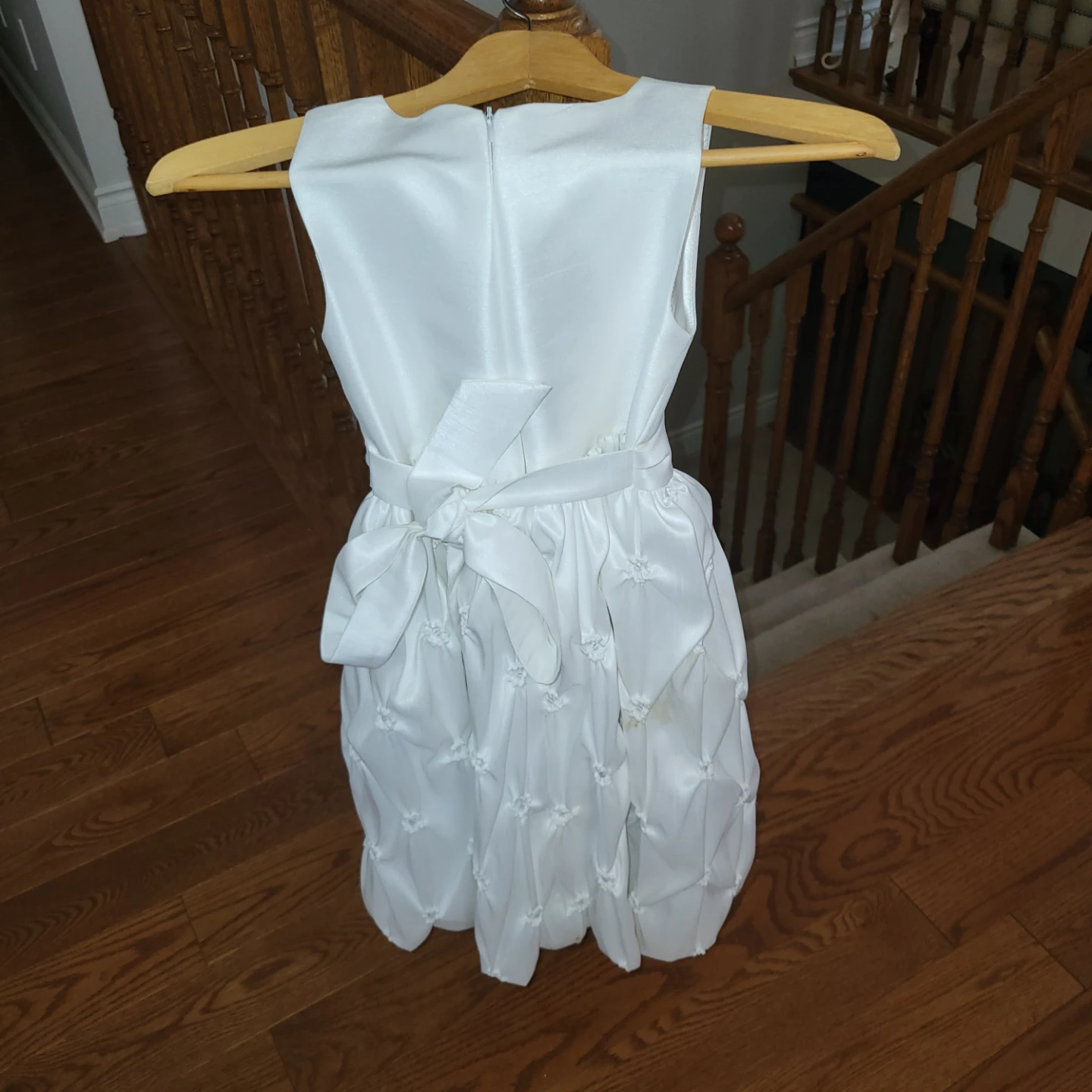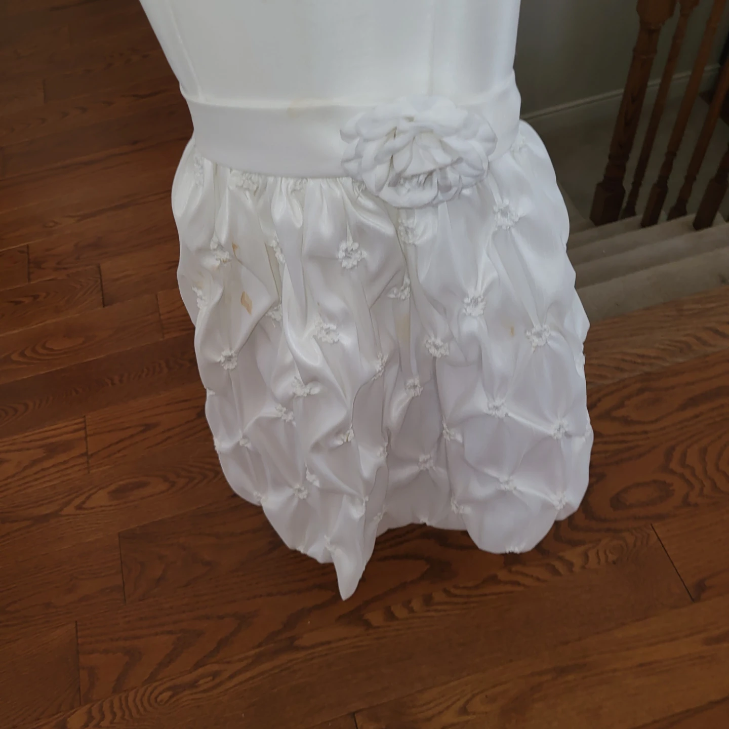Beautiful white polyester dress with a satin sash and floral accents. It features a layered skirt with a delicate tulle underskirt.
