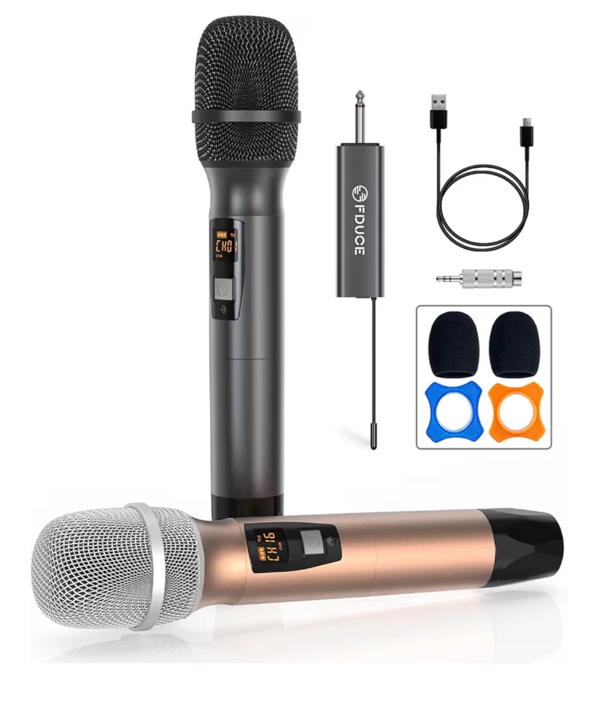 This is a FDUCE wireless microphone system with a receiver. It comes with a charging cable and adapter. It's great for karaoke or presentations!