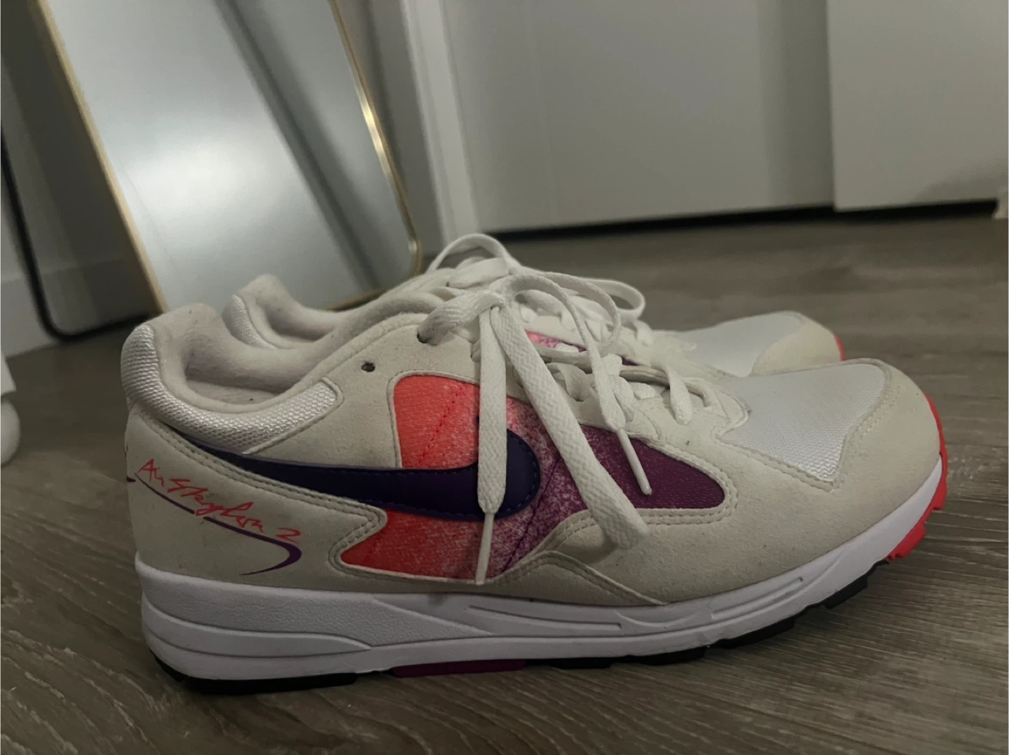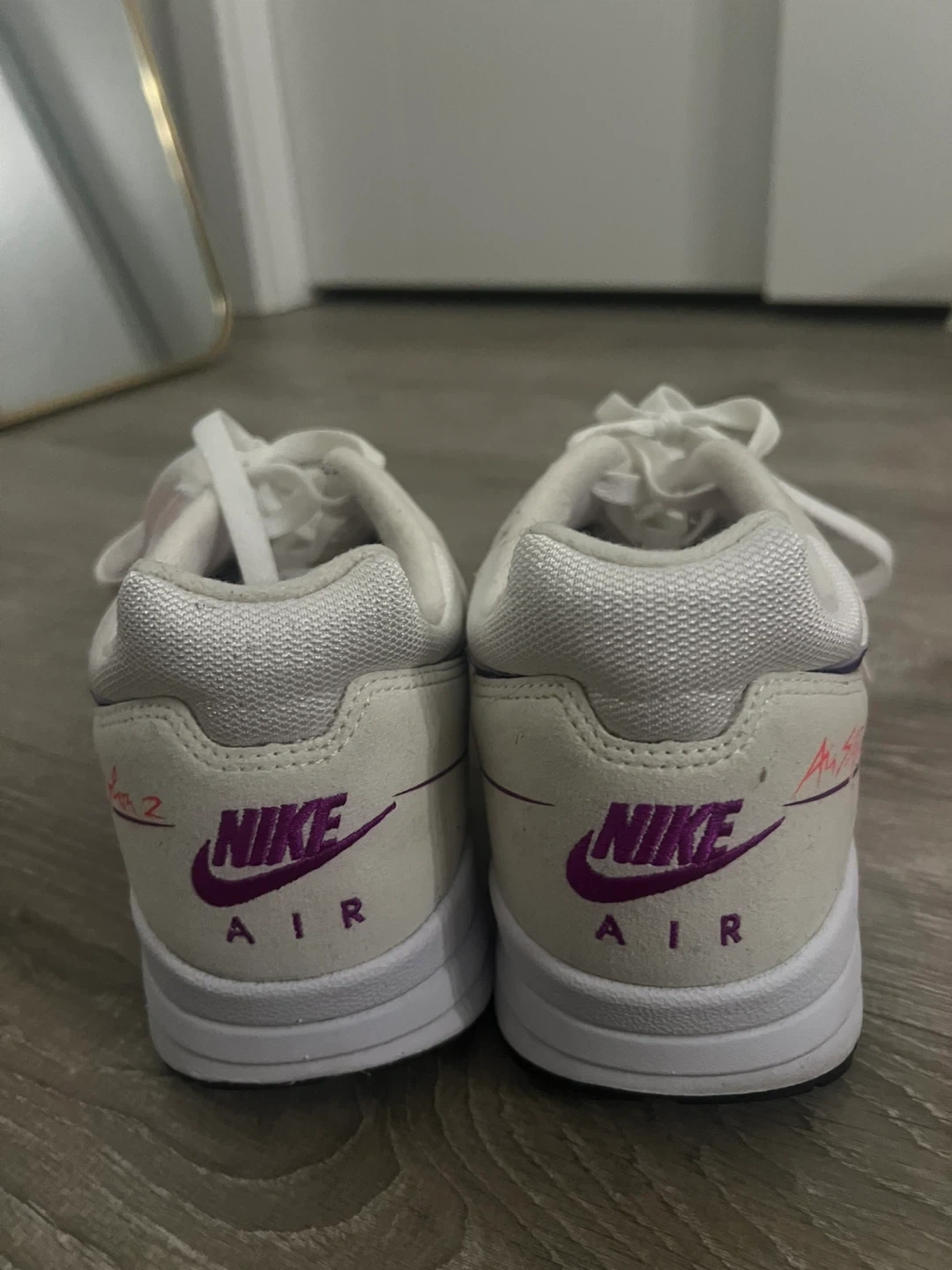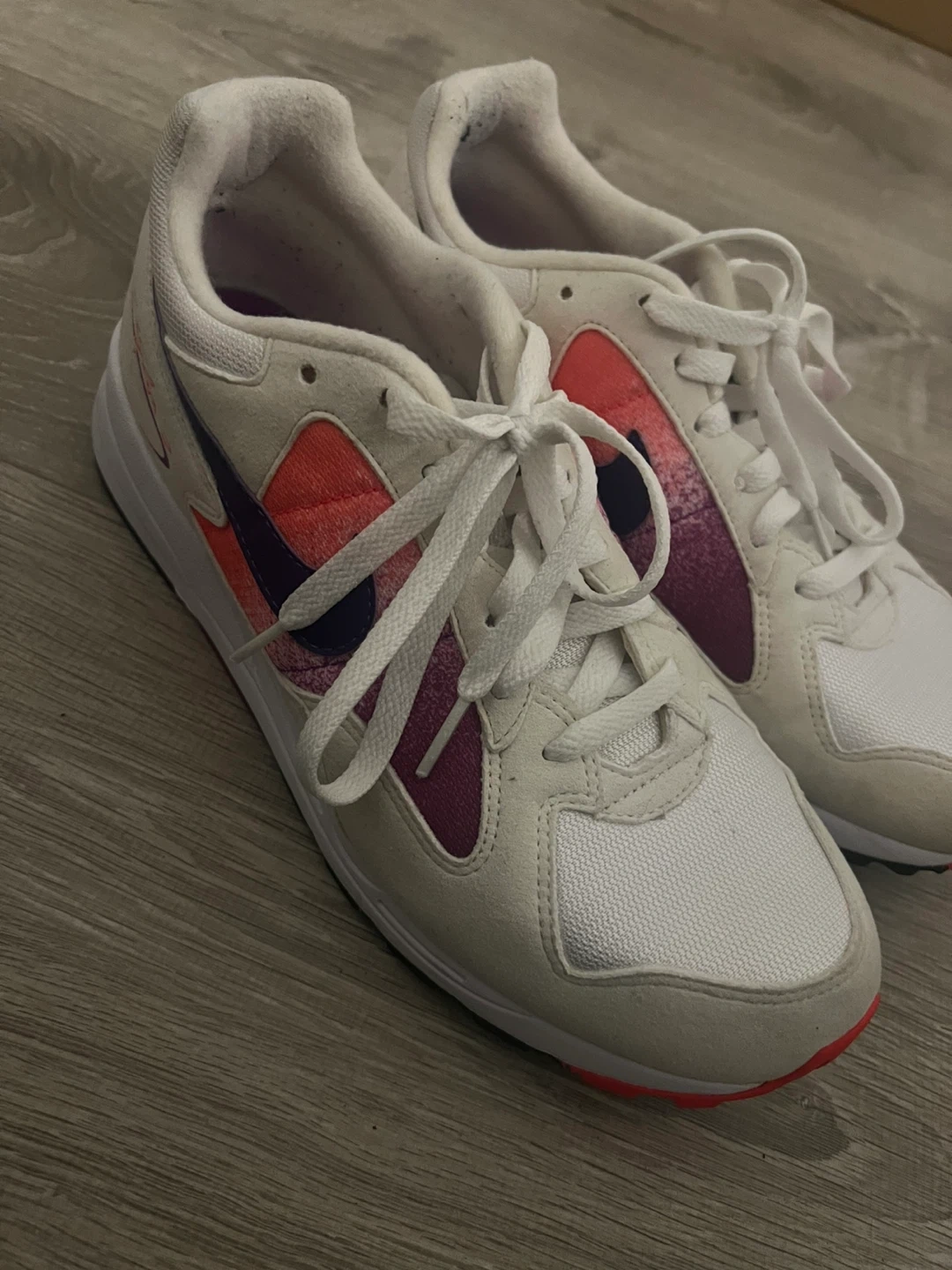Classic white Nike Air Max sneakers with colourful accents. These shoes feature a comfortable design and durable construction. Perfect for everyday wear and light athletic activities.Womens size 9.