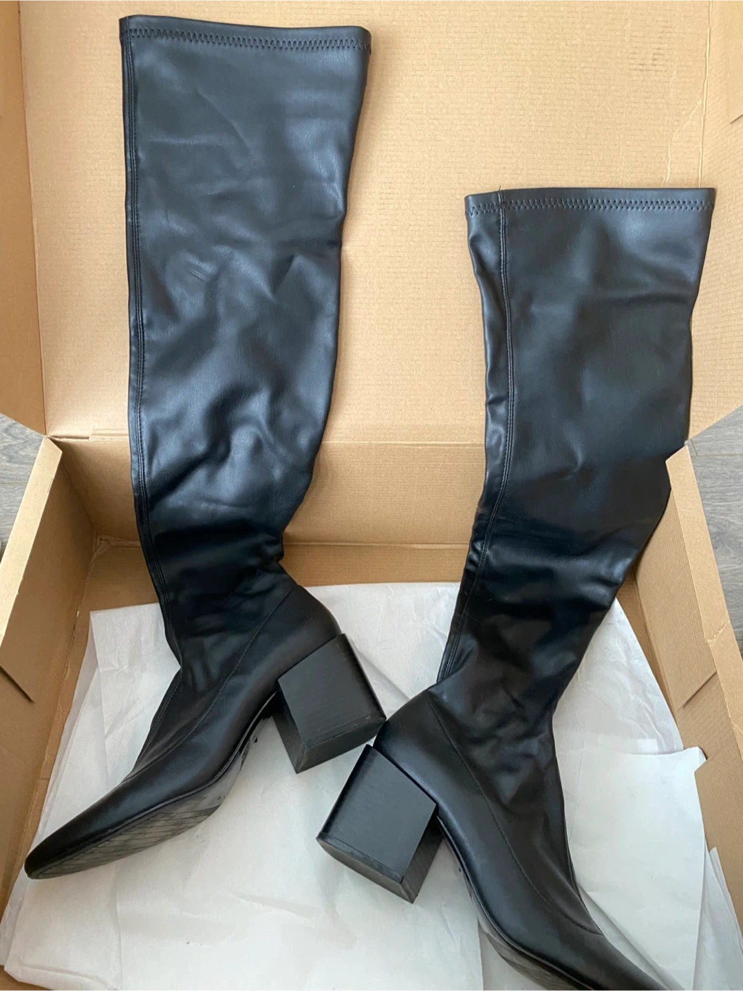 These ZARA black knee-high boots feature a block heel and pointed toe. They are a size 38. These are a versatile boot that can be worn with dresses or pants.
