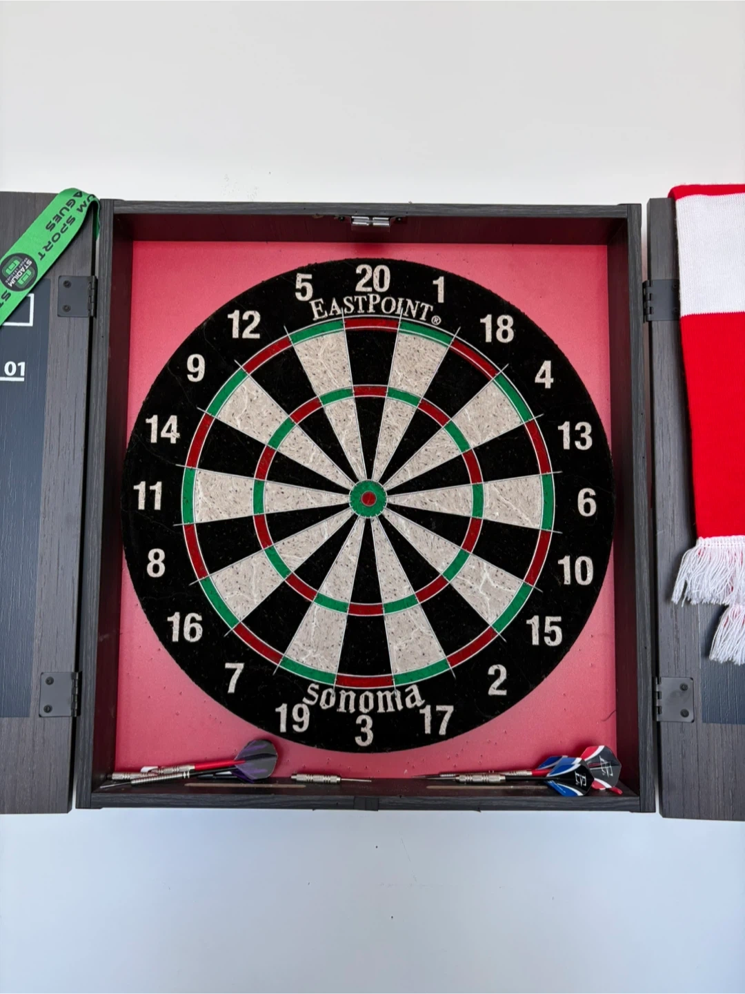 This Eastpoint dartboard is housed in a dark grey cabinet with a red interior. It includes a dartboard with numbers and several darts. It's a complete set ready for a game of darts!