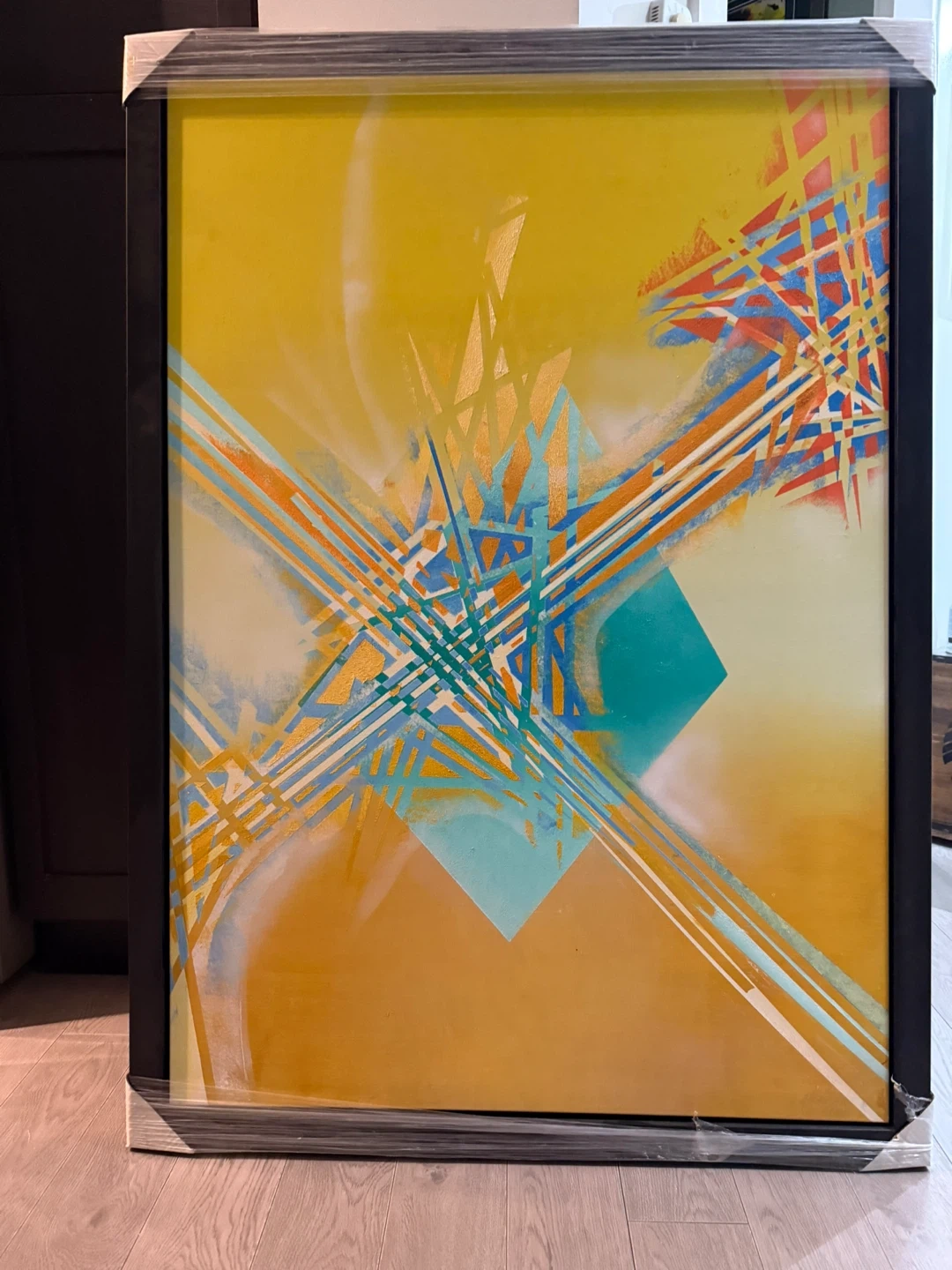 This is a vibrant abstract art painting. It features a striking blend of yellow, orange, teal, blue, and red geometric lines and shapes. The artwork is framed in black. Artist name. Waldemar Smolarek1937-2010