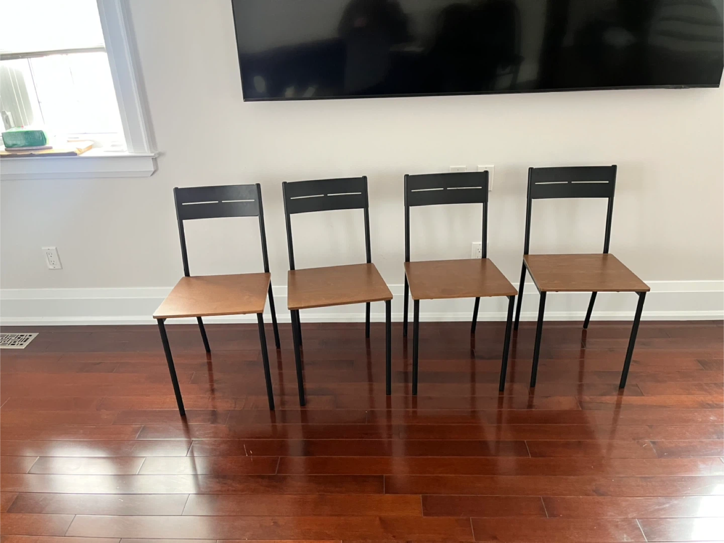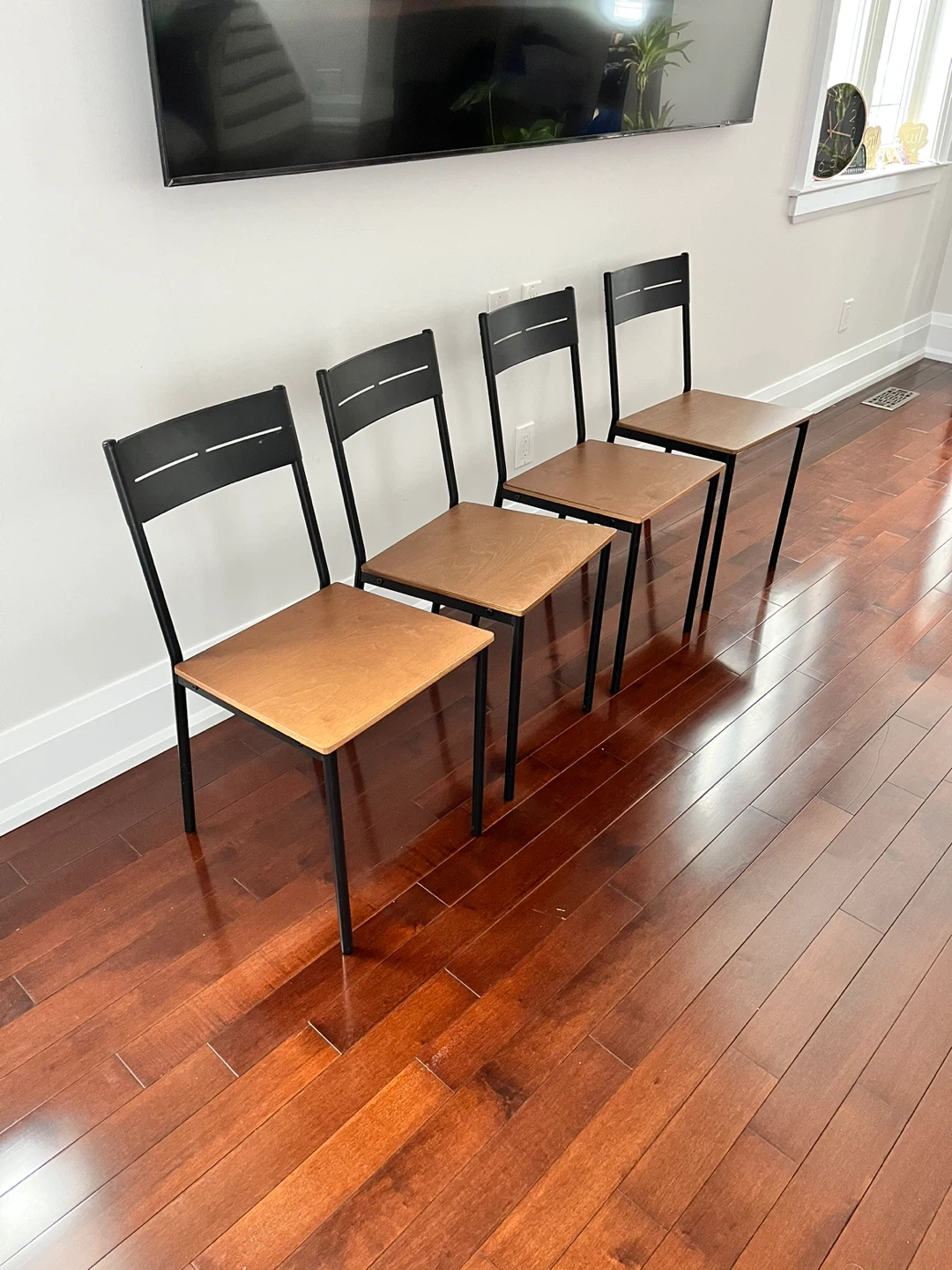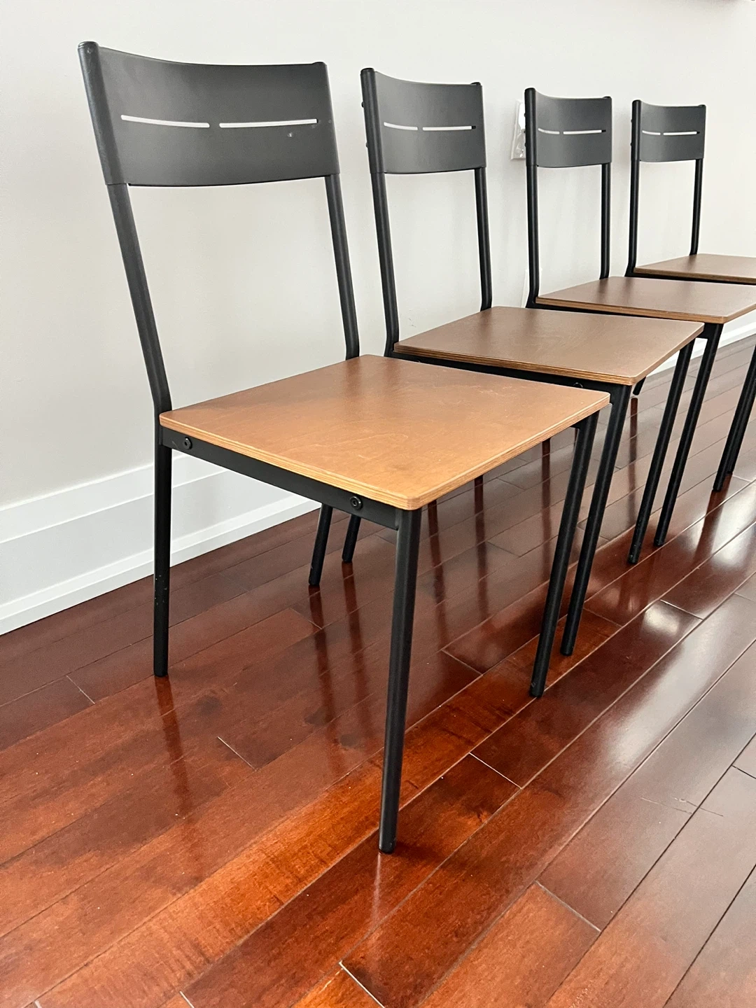 Set of four modern dining chairs. These chairs feature black metal frames and light wood-look seats and backrests. They're suitable for a dining area or as extra seating.