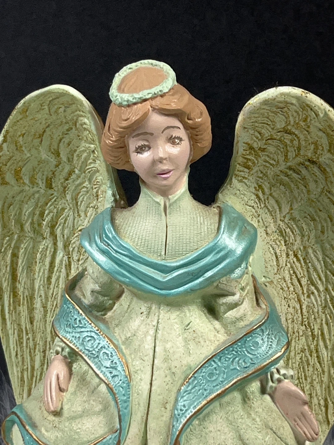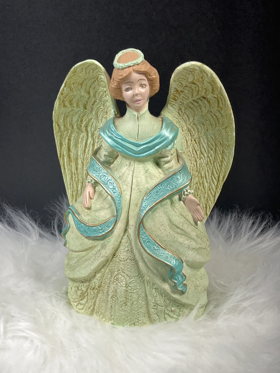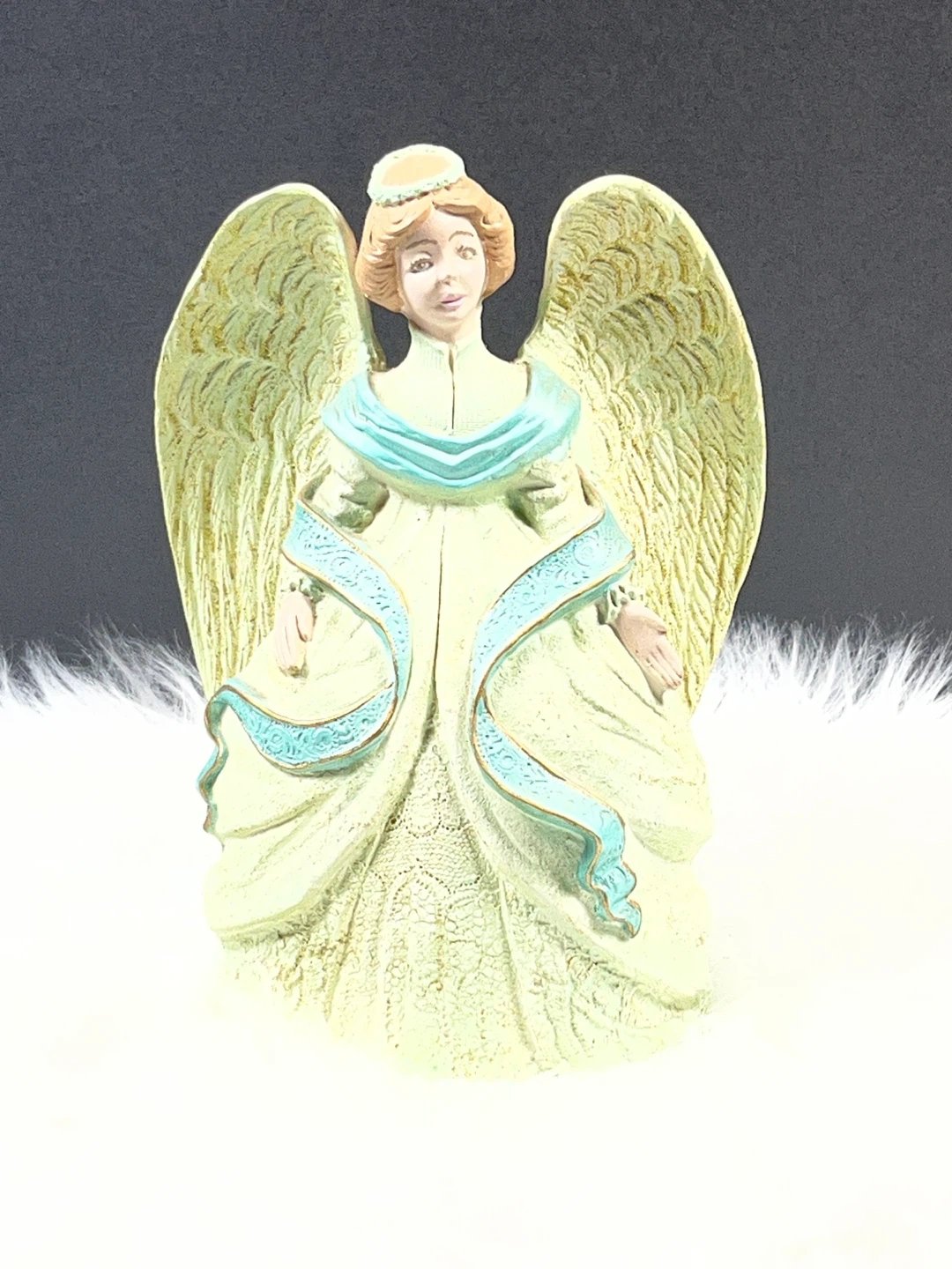 This is a charming vintage angel figurine. It features a detailed dress with blue accents and large feathered wings. Perfect for adding a touch of elegance to your home decor!