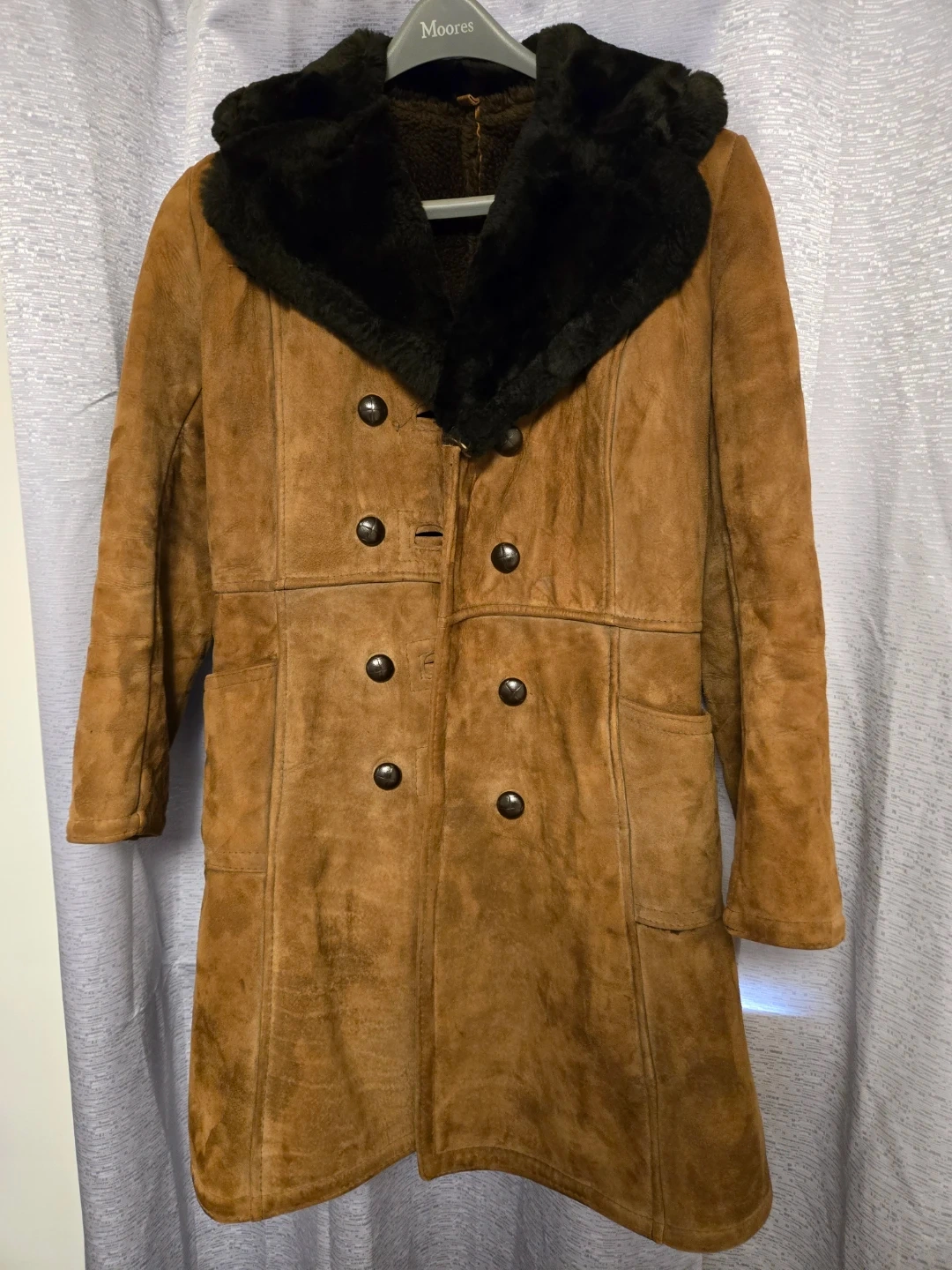Warm double-breasted coat in brown suede. It's lined with dark shearling and features a fur collar. Includes two side pockets and dark button closures. This coat offers excellent warmth for colder weather.