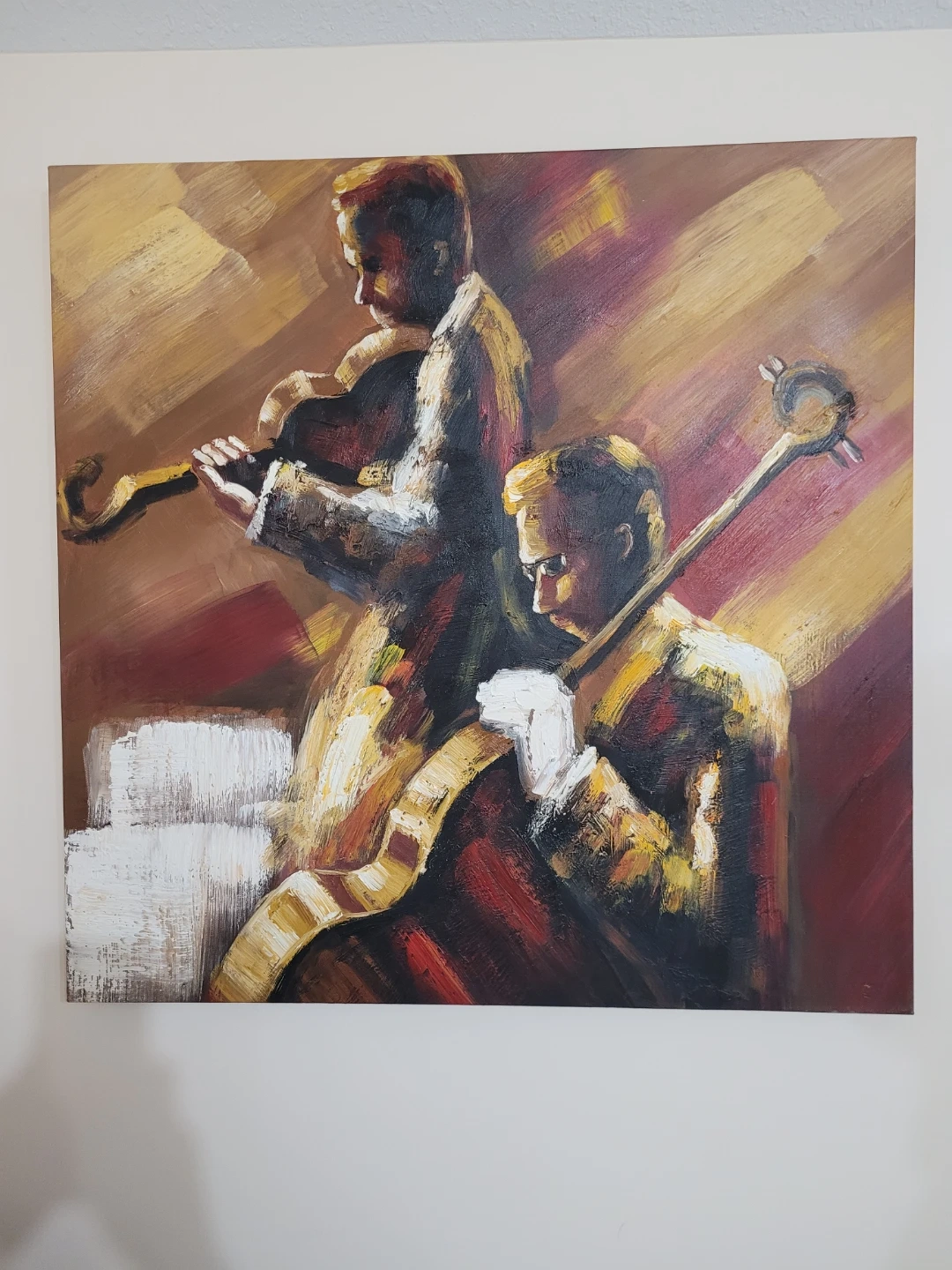 Abstract painting depicting two musicians playing instruments. Features bold brushstrokes and warm colours. This artwork would add a touch of artistic flair to any room.