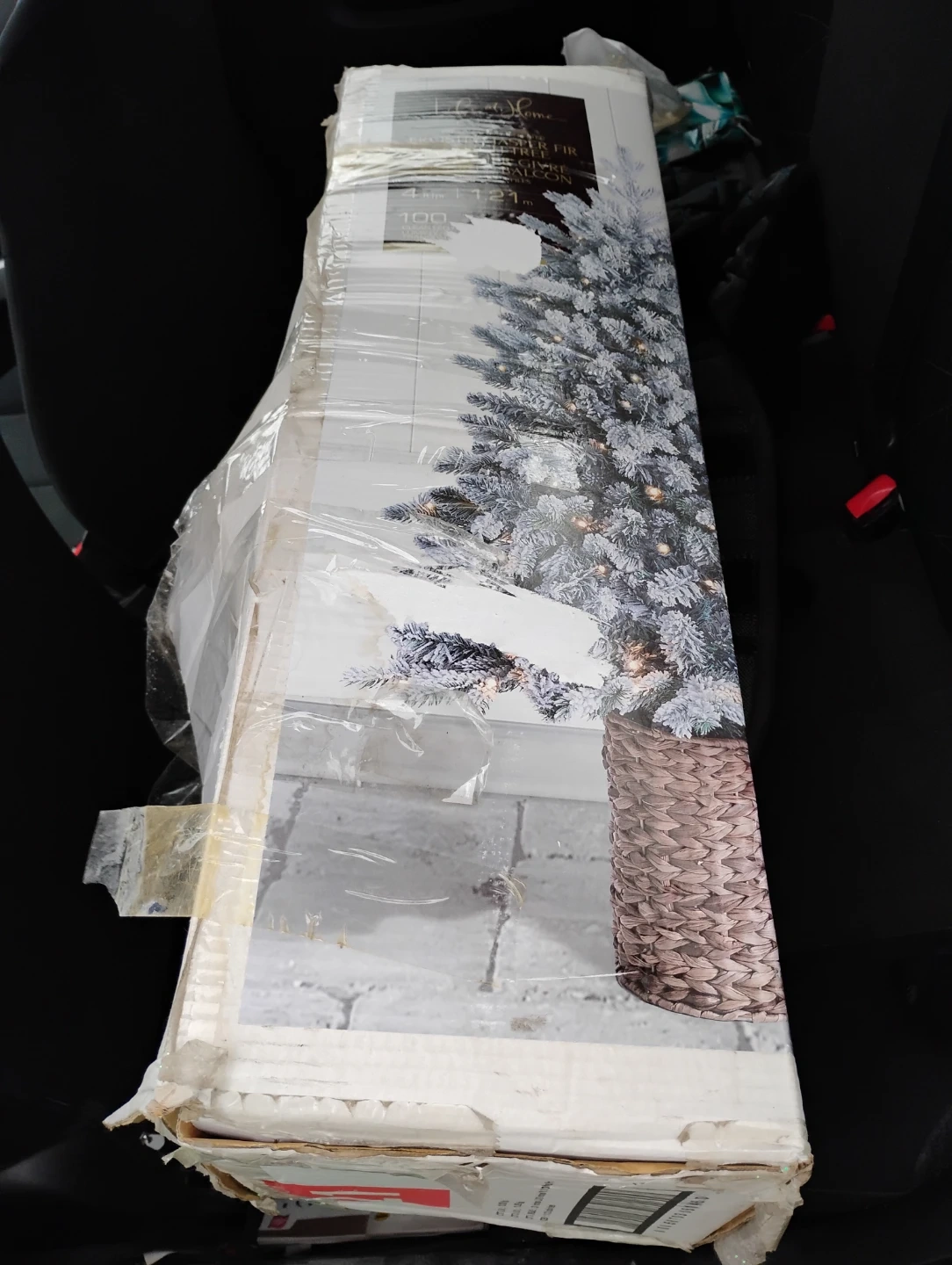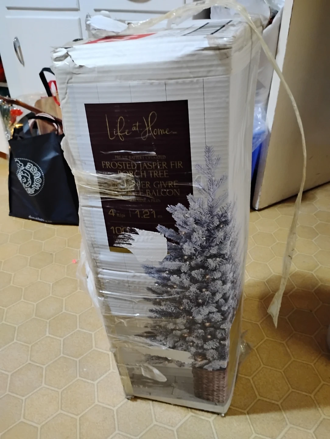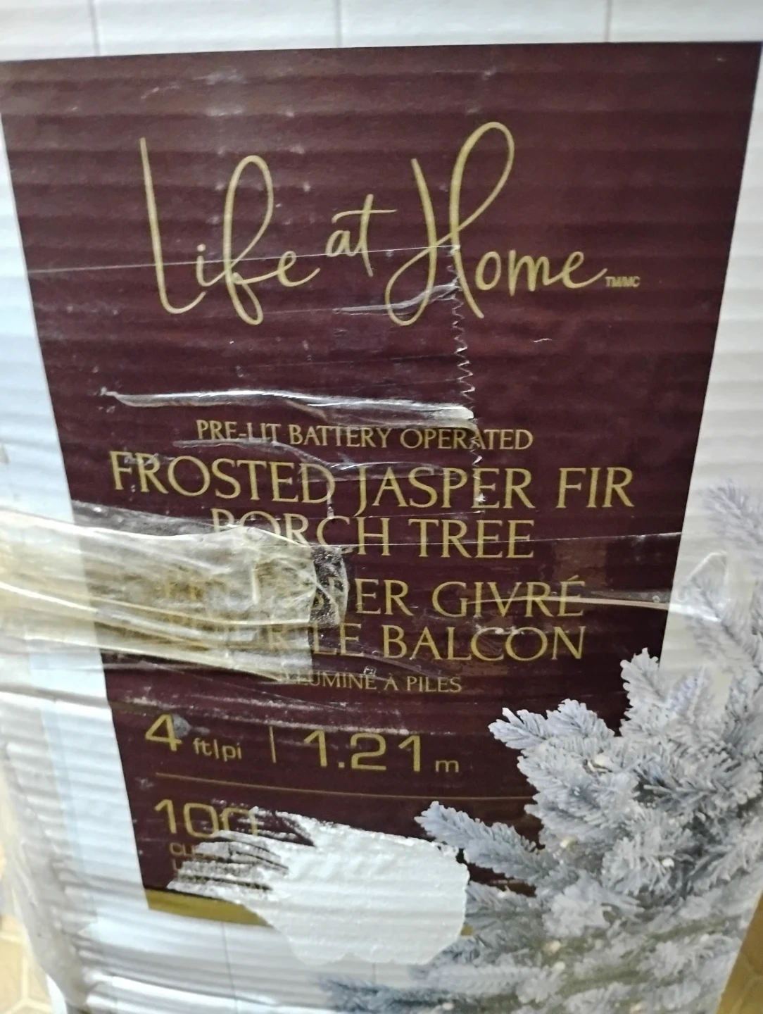 Pre-lit, battery-operated frosted jasper fir porch tree. It's 4 ft tall with 100 clear lights. Suitable for indoor or outdoor use.