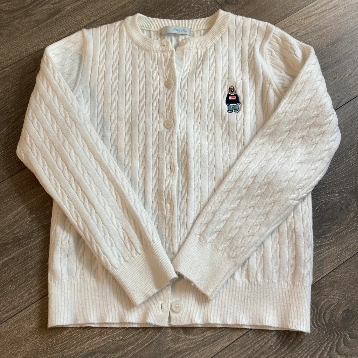 A sweet white cable knit cardigan for little ones. It features a playful bear patch on the chest and a button-up front. Made from a comfortable knit material.