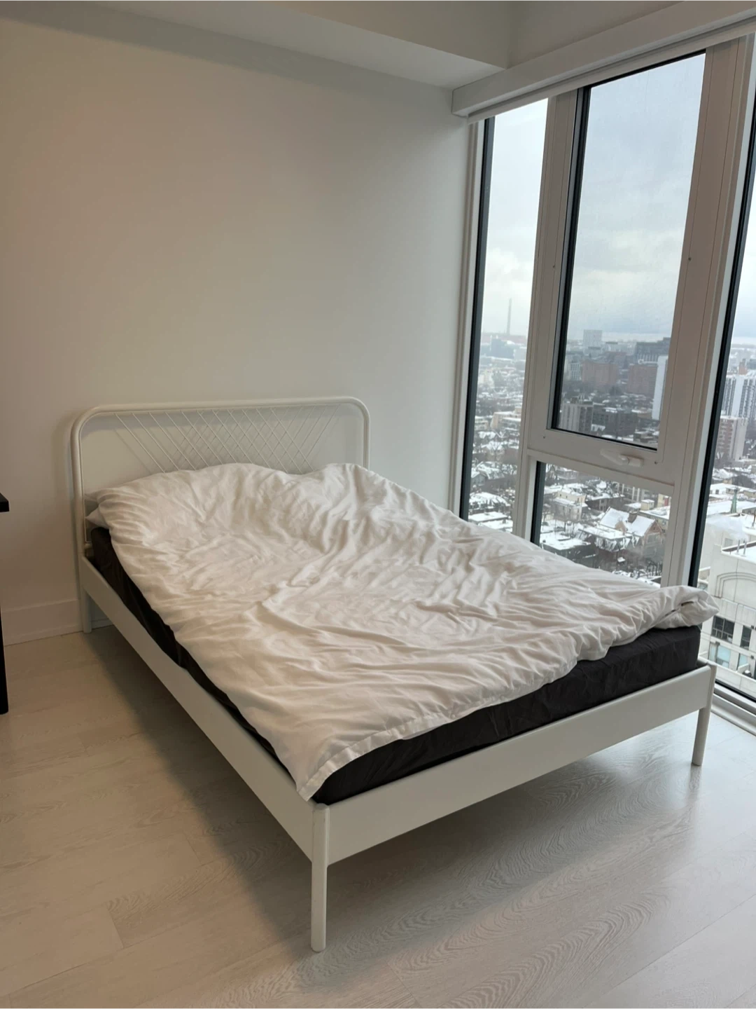 Selling a white IKEA Nesttun bed frame in Double size. It's made of powder-coated steel for durability. This bed frame's simple design fits various decor styles.