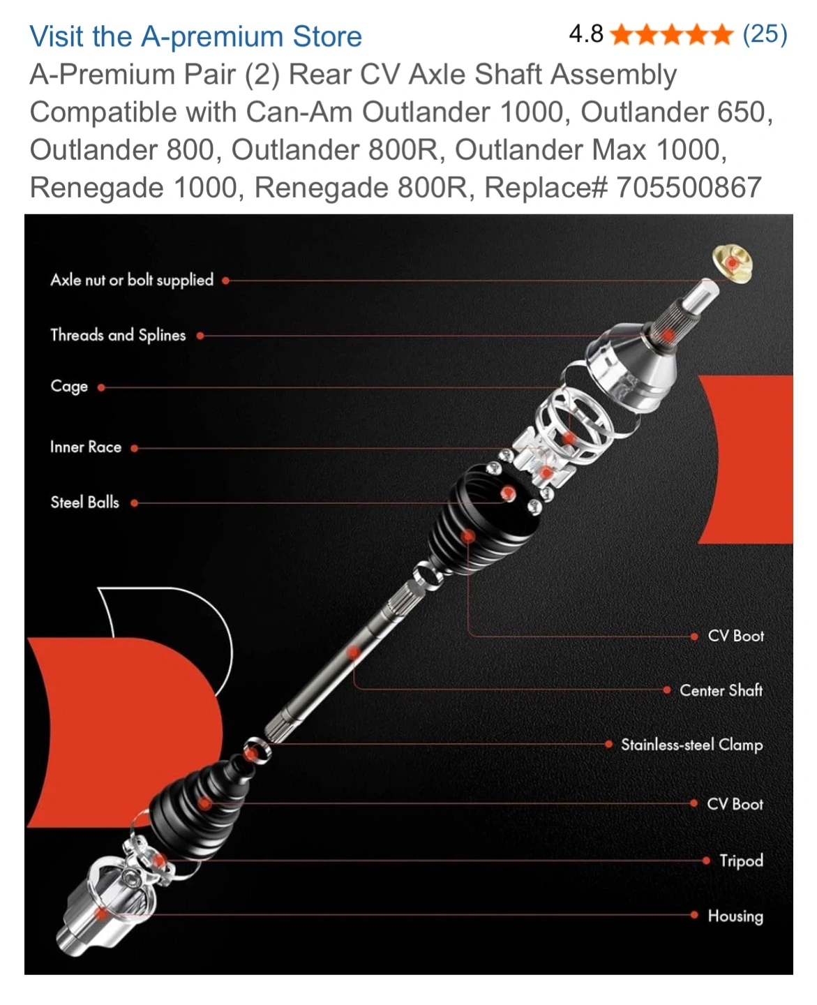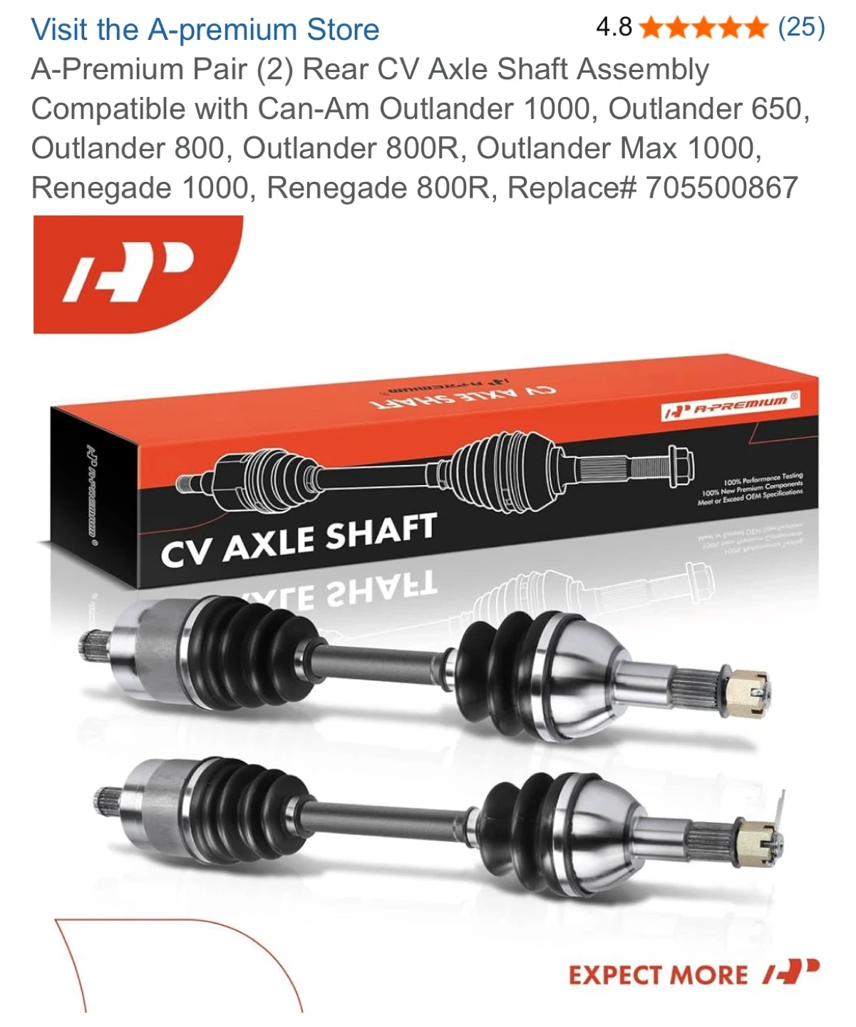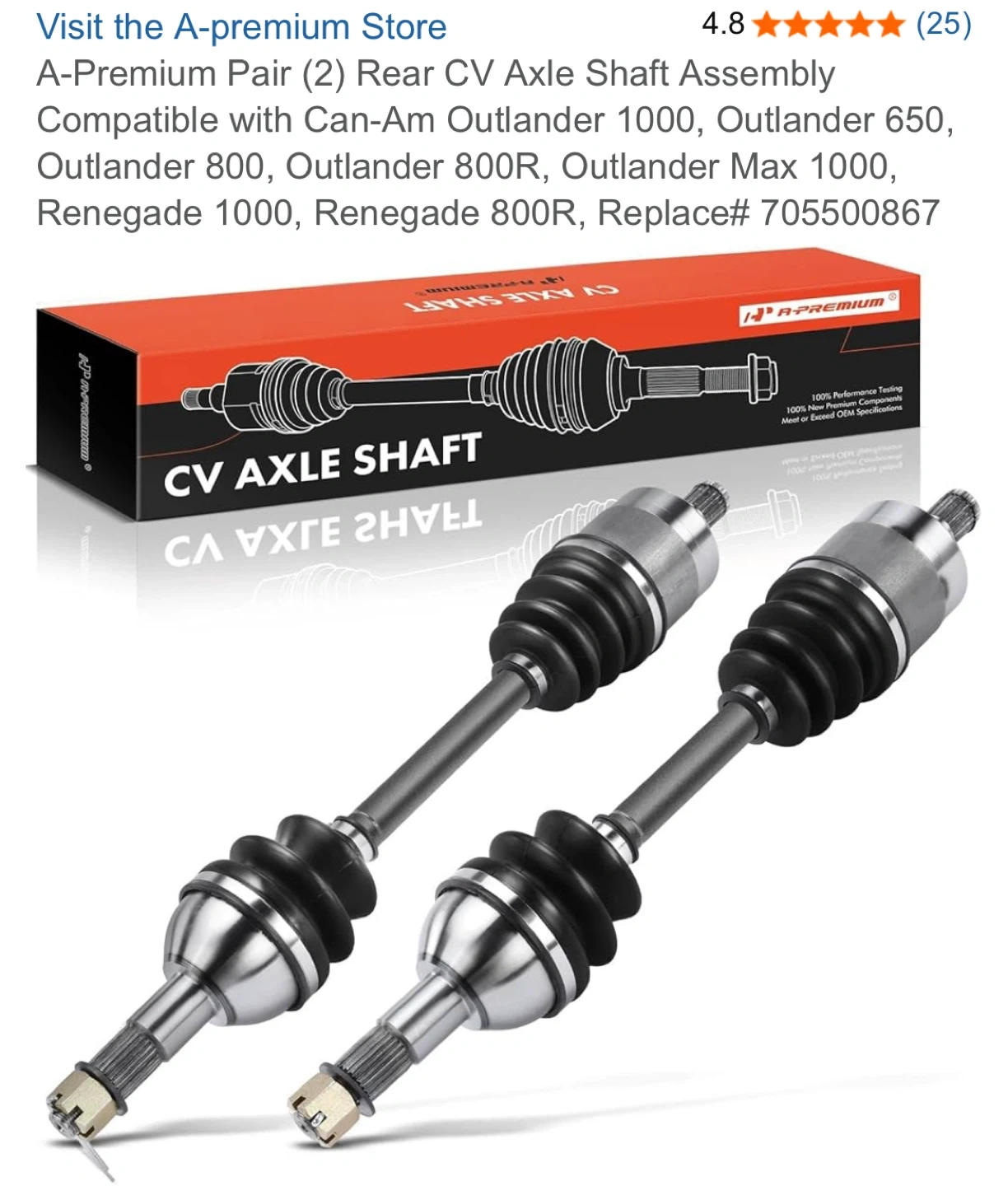 Selling a pair of A-Premium rear CV axle shaft assemblies. These are compatible with Can-Am Outlander 1000, Outlander 650, Outlander 800, Outlander 800R, Outlander Max 1000, Renegade 1000, and Renegade 800R models. They are designed to replace part number 705500867. These axles feature outer and inner CV joints, precision ground to O.E. standards for a seal surface, and high strength and durability