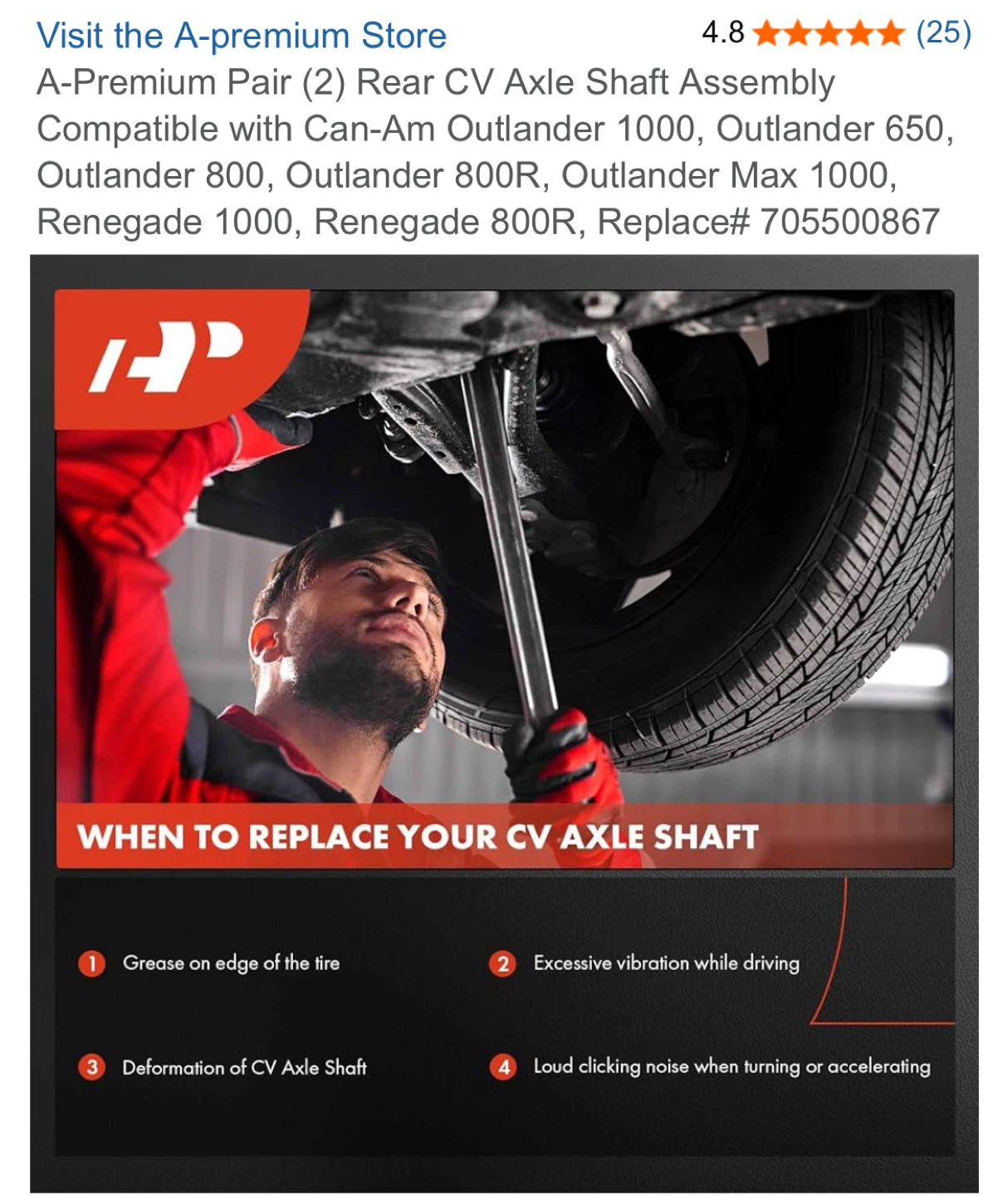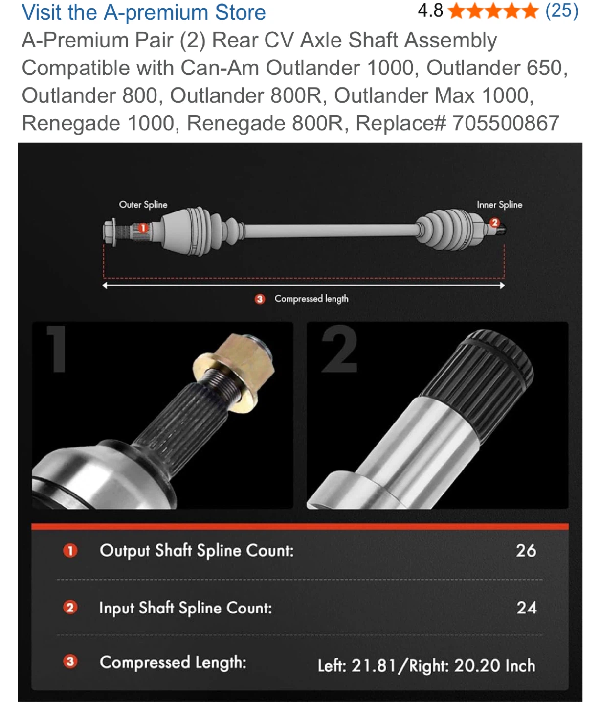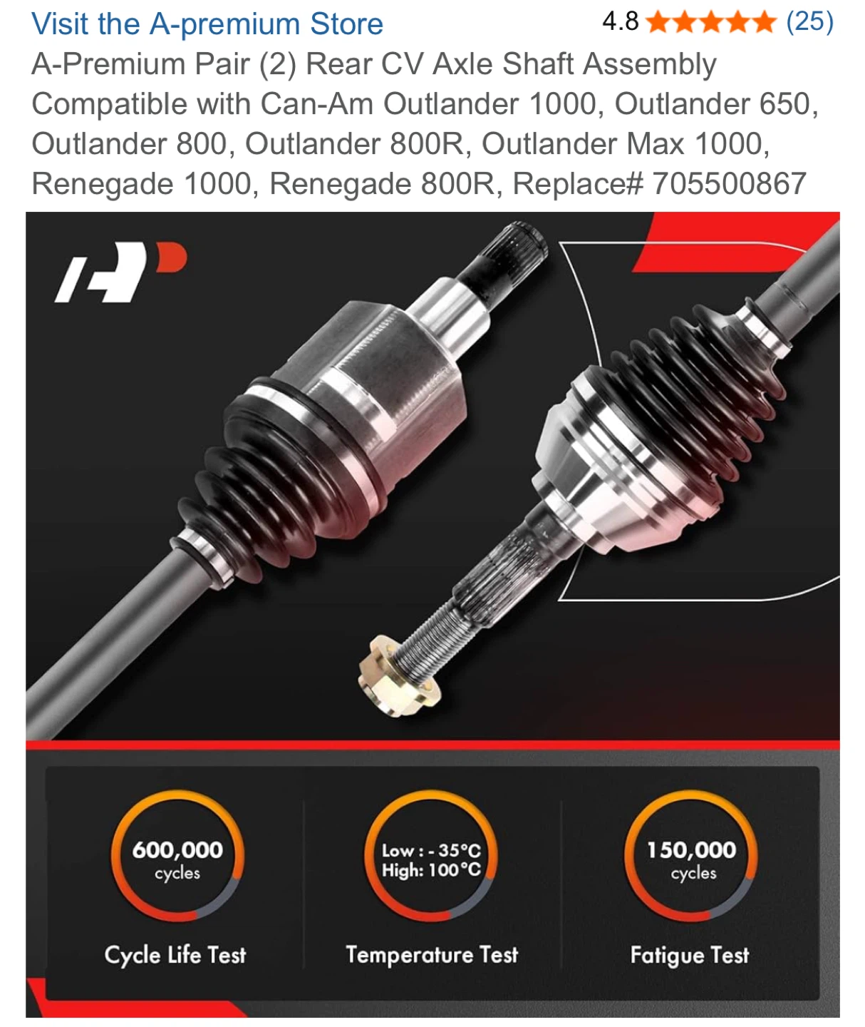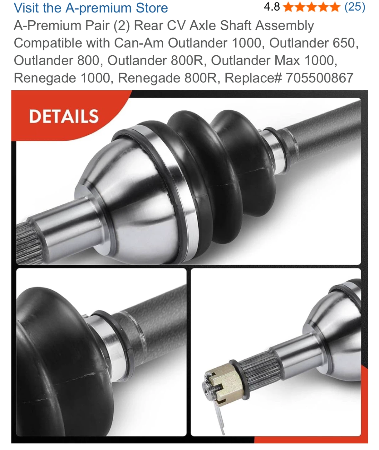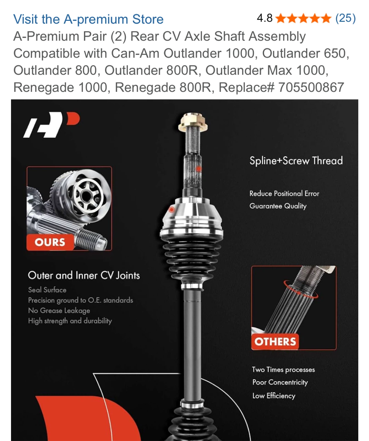 Selling a pair of A-Premium rear CV axle shaft assemblies. These are compatible with Can-Am Outlander 1000, Outlander 650, Outlander 800, Outlander 800R, Outlander Max 1000, Renegade 1000, and Renegade 800R models. They are designed to replace part number 705500867. These axles feature outer and inner CV joints, precision ground to O.E. standards for a seal surface, and high strength and durability