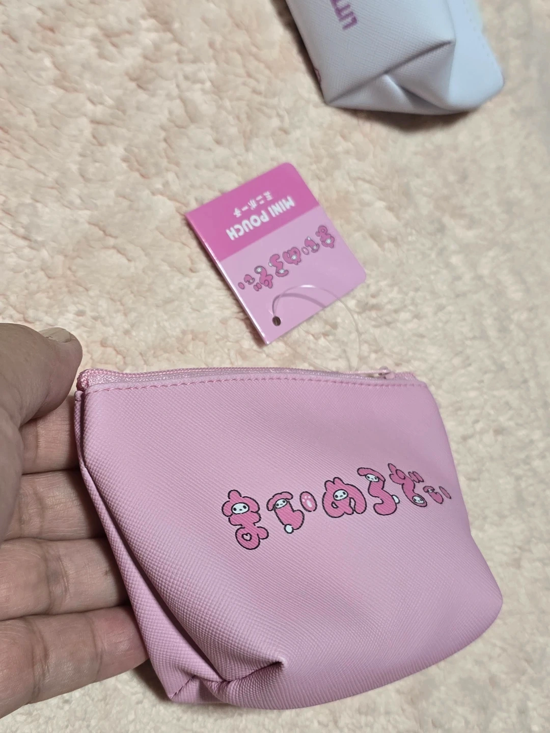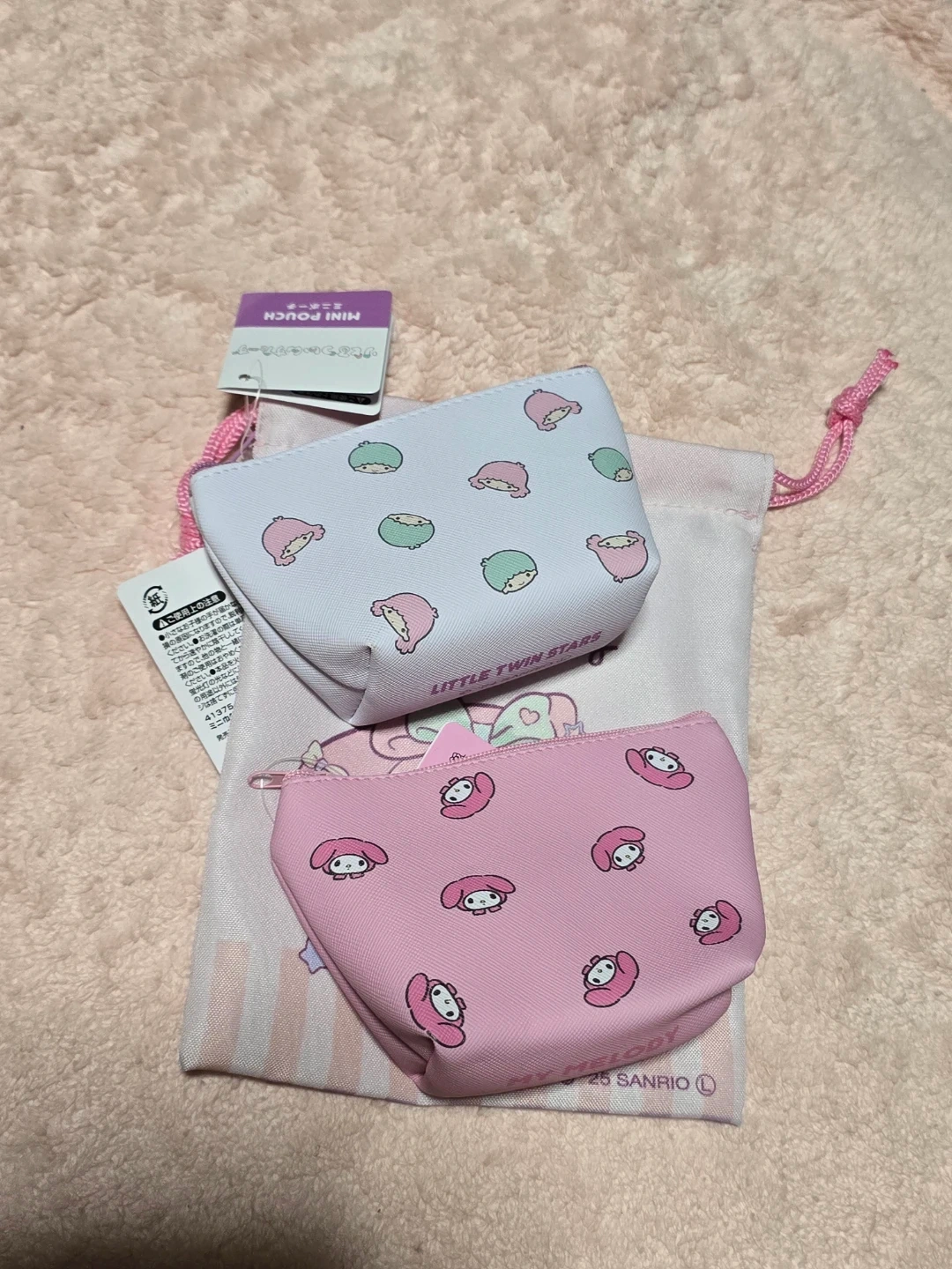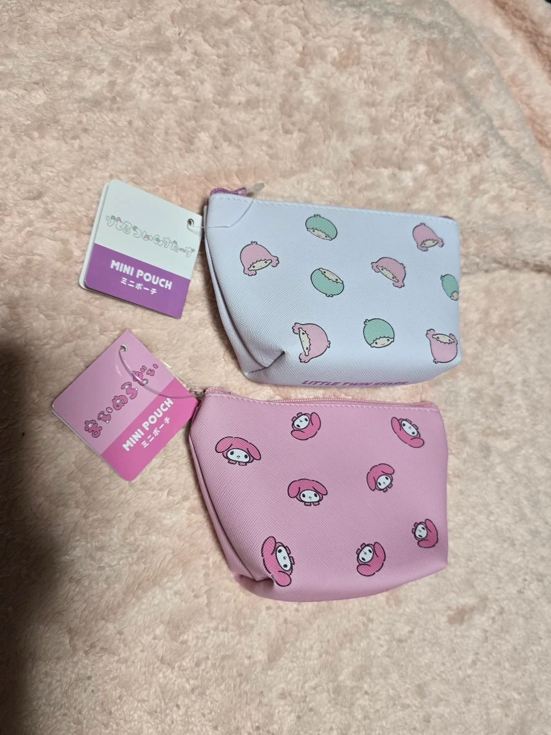 Set of two Sanrio mini pouches, one pink with My Melody and one light purple with Little Twin Stars. Perfect for organizing small items like coins, keys, or makeup. Zipper closure included.
