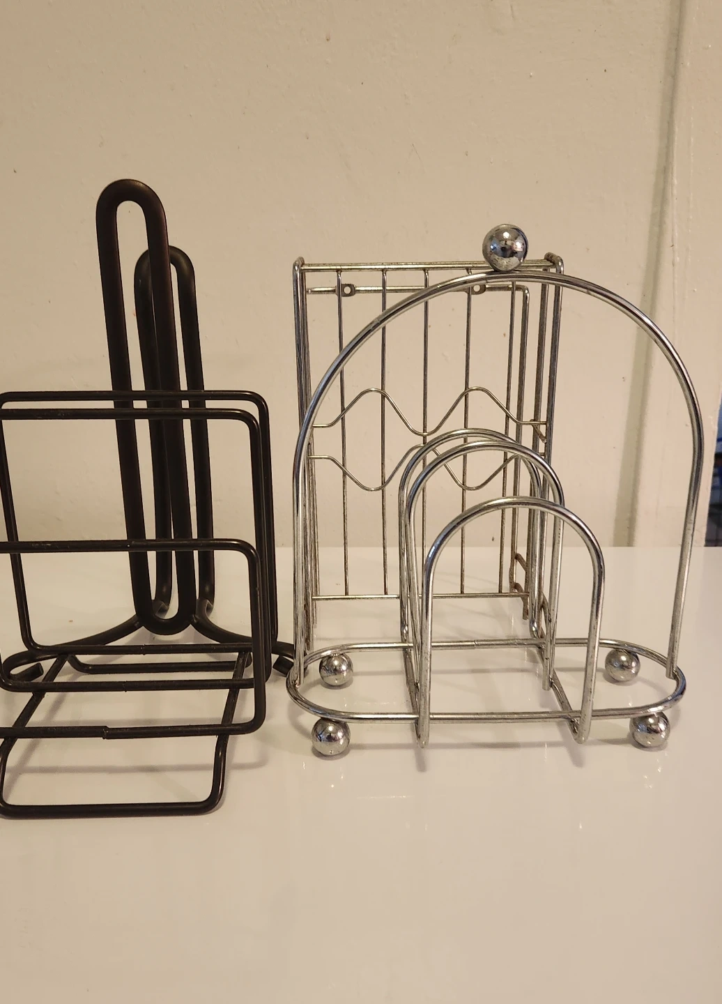 This post Includes one chrome wire napkin holder with a decorative top and a black metal napkin holder, a knife holder, and a magazine holder they all are sturdy and functional for your kitchen or dining table. These holders keep napkins tidy, your knives in order and other accessible. Price is $10 for the bundle.