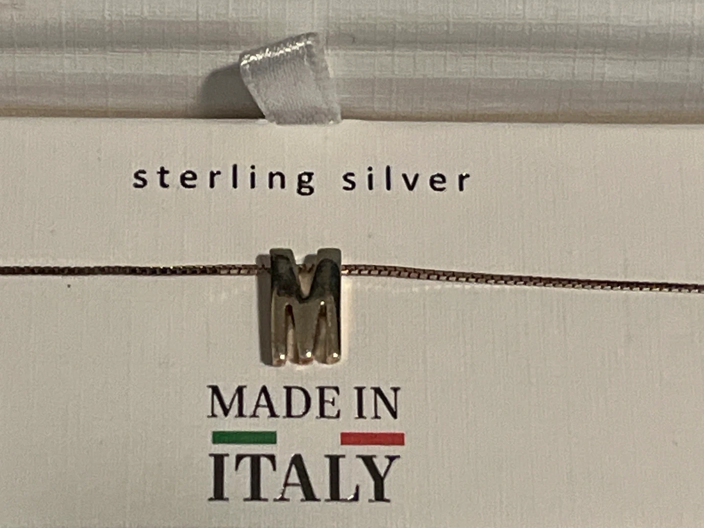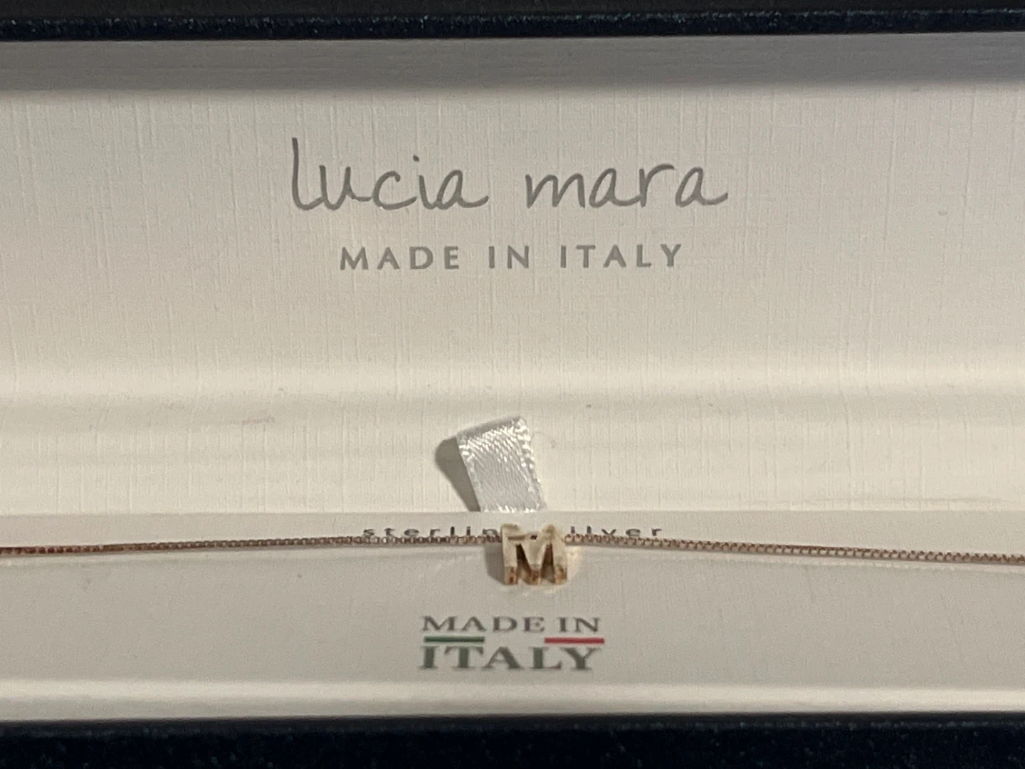 Lucia Mara bracelet with an 'M' initial charm. Sterling silver construction made in Italy. The bracelet measures 6.5 plus 1 inch for adjustable length. Includes the original box!