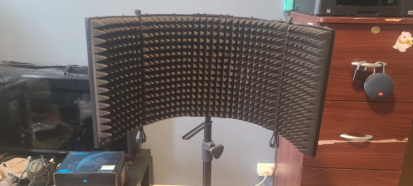 This bundle includes a Shure MV7 microphone, an Auray tripod microphone stand, and a pop filter. It's perfect for vocal recording. The mic comes in its original box with all accessories. The tripod stand is adjustable for height.