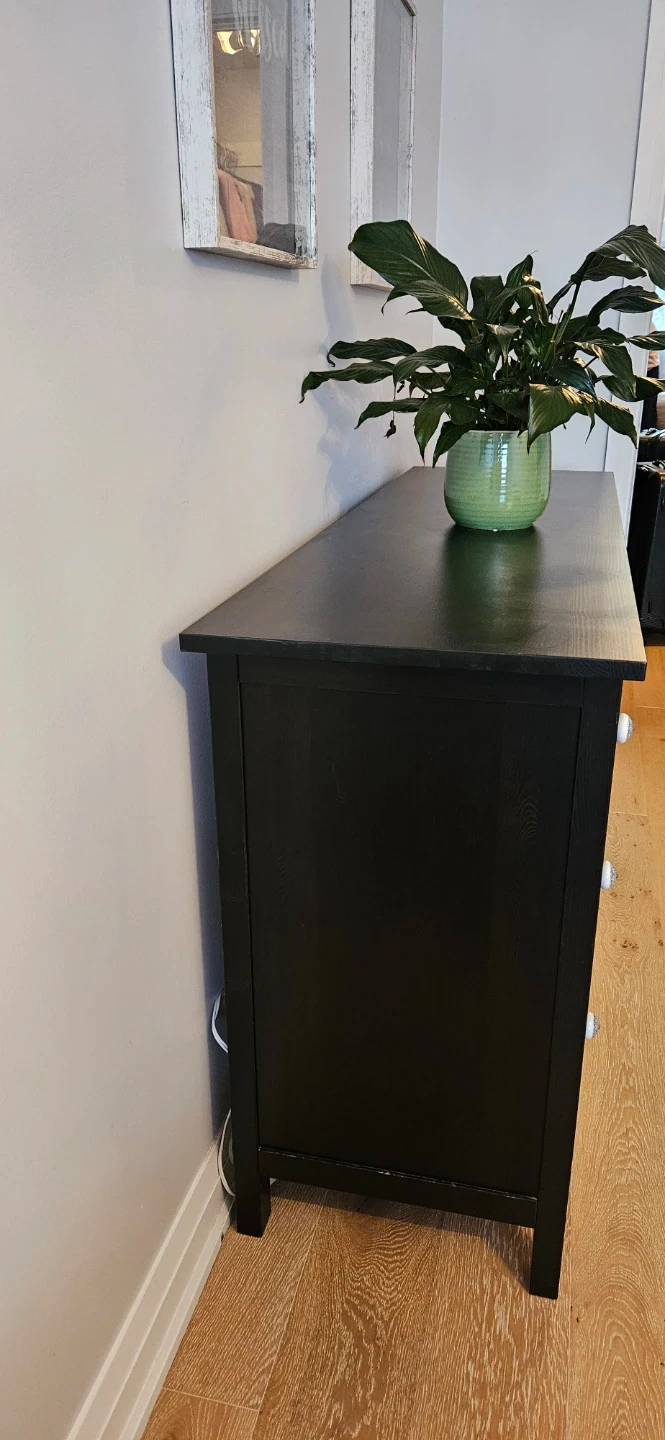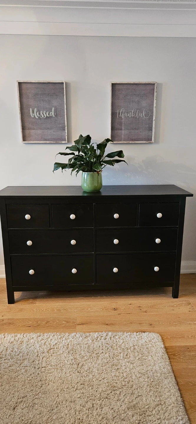 This dresser has a black finish and eight drawers for storage. It's made of wood and has white silver knobs. It's a great piece for organizing clothes or other household items.