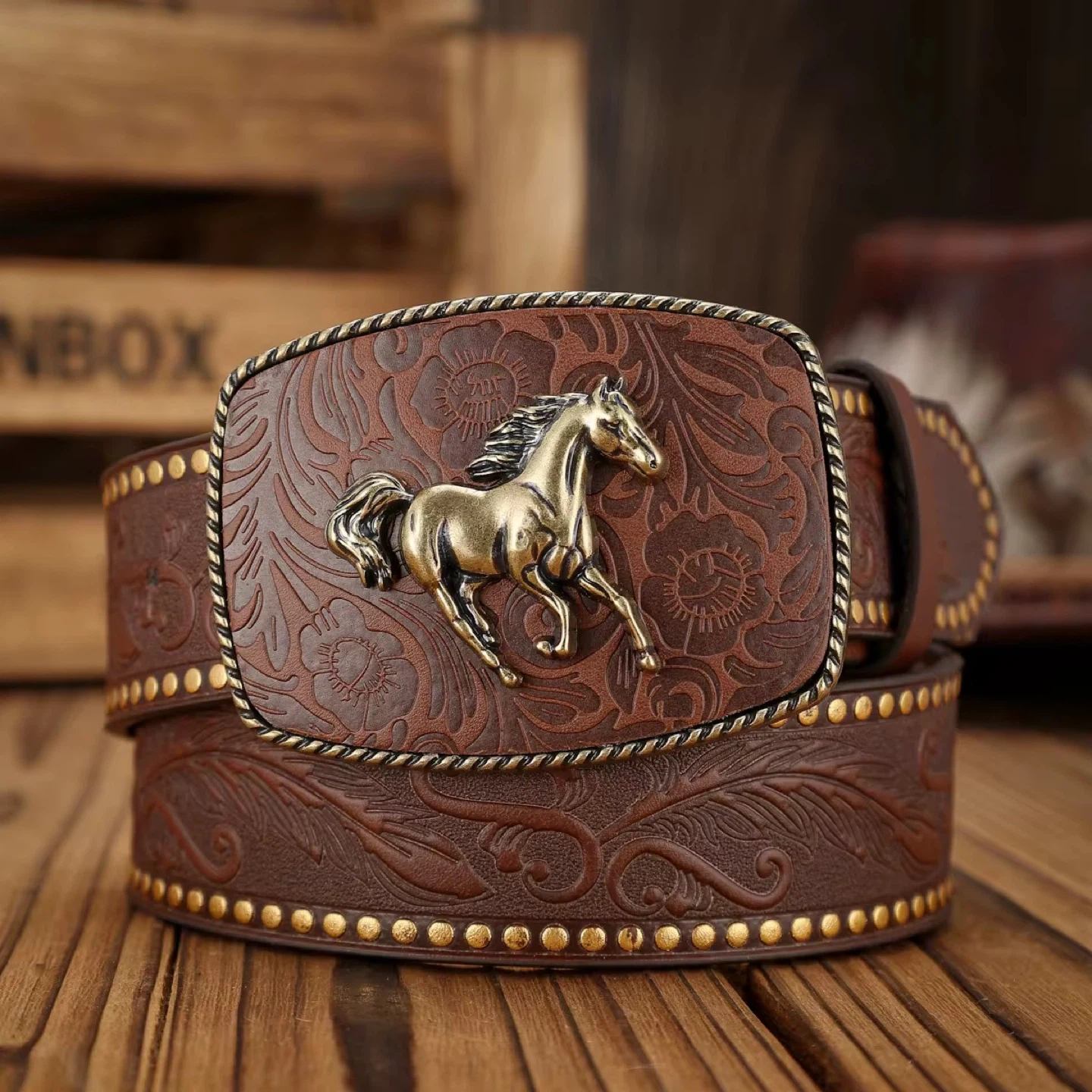 This stylish belt buckle features an embossed horse design with decorative stitching. It's made from durable alloy metal and has a classic Western look. It's perfect for adding a touch of flair to any outfit!