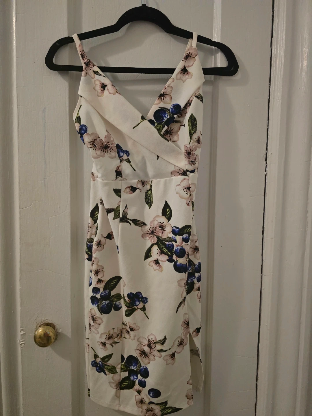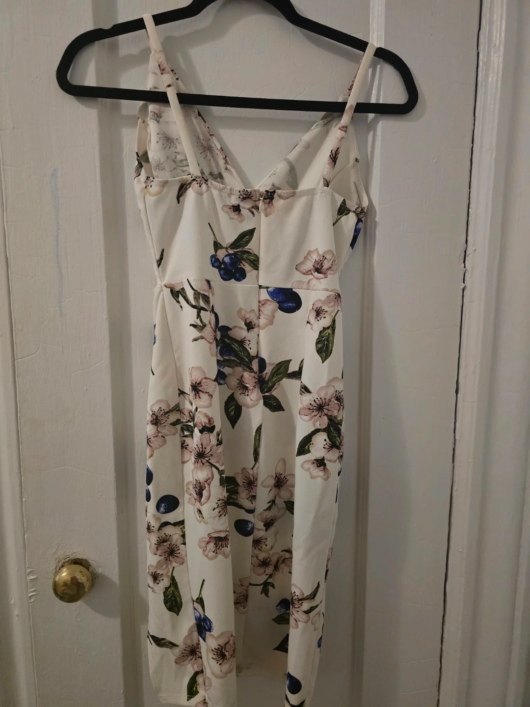 This white midi dress features a charming all-over floral and berry print. It has a flattering V-neckline and adjustable spaghetti straps. A perfect dress for spring or summer occasions!