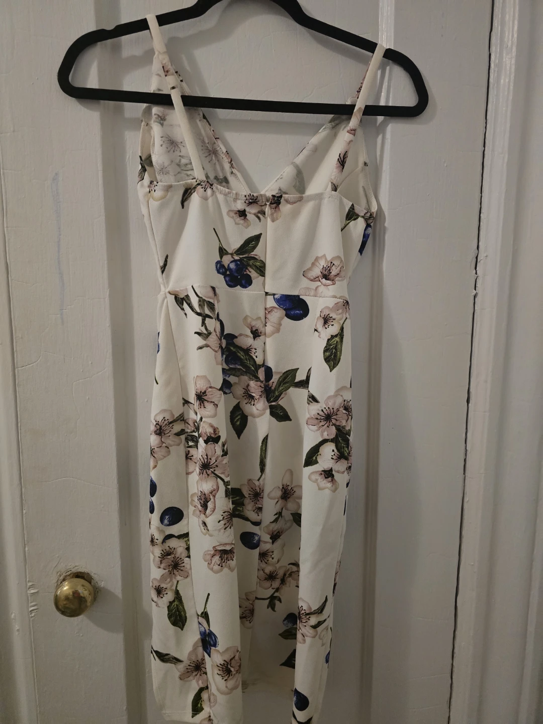 This white midi dress features a charming all-over floral and berry print. It has a flattering V-neckline and adjustable spaghetti straps. A perfect dress for spring or summer occasions!