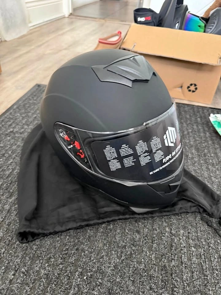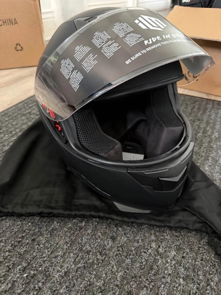 Brand new ILM full face motorcycle helmet in size XL. Features a sleek matte black finish and a quick release chin strap. The visor still has its protective film on it. Comes with a black dust bag. DOT certified.