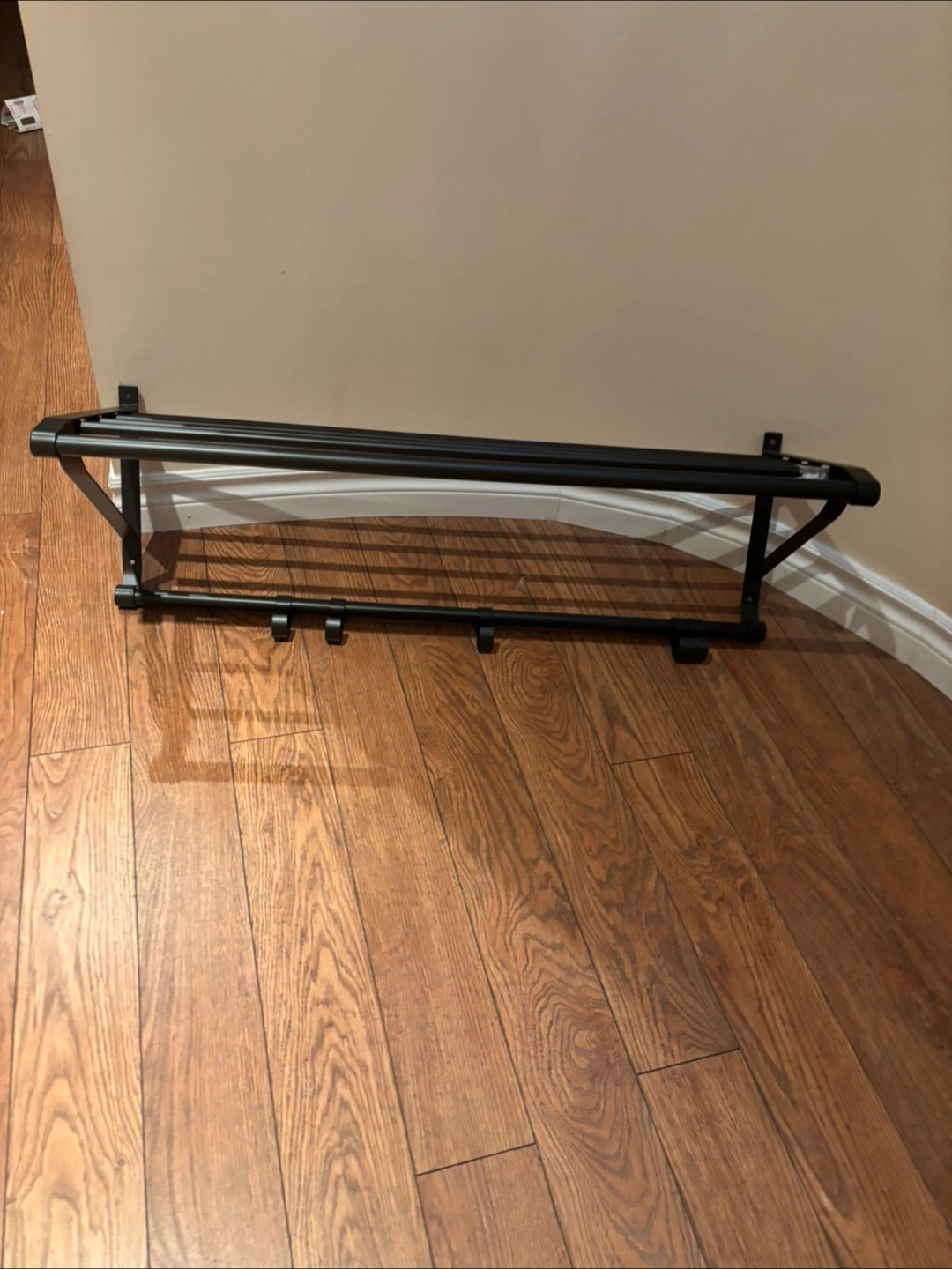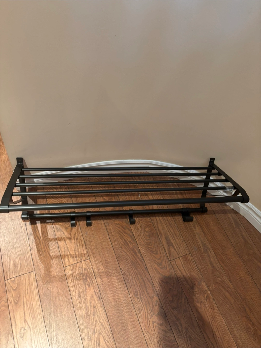 Selling a wall-mounted coat rack in black metal. It's in great shape and ready to add some extra storage to your entryway or closet! The rack is approximately 36 inches wide, perfect for hanging coats, hats, and scarves
