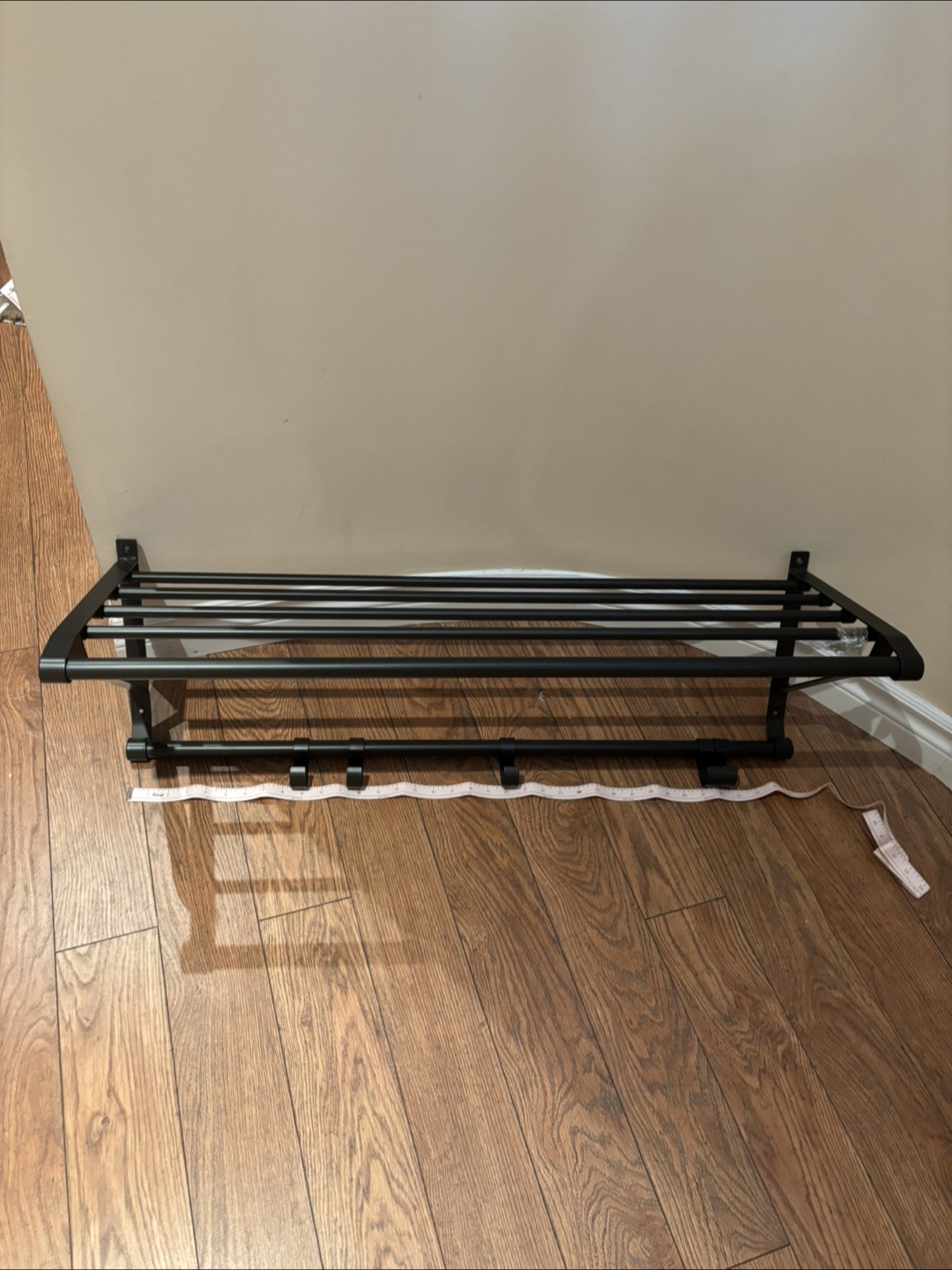 Selling a wall-mounted coat rack in black metal. It's in great shape and ready to add some extra storage to your entryway or closet! The rack is approximately 36 inches wide, perfect for hanging coats, hats, and scarves