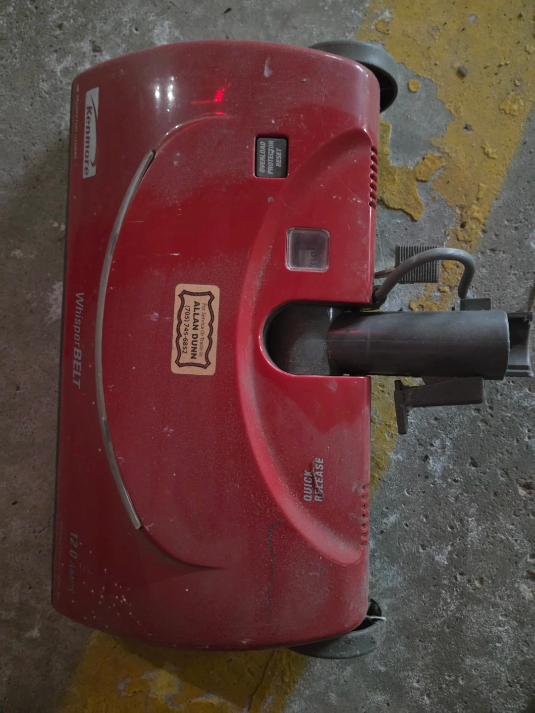 This red Kenmore vacuum cleaner features a "Whisper Belt" and "Quick Release". It's a 12.0 amp model. This vacuum is good for home cleaning.