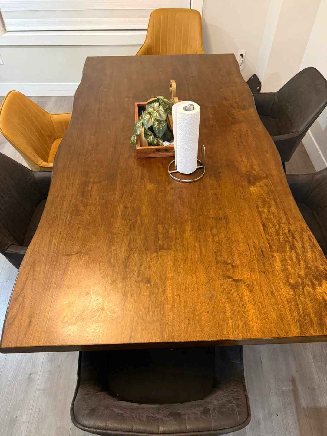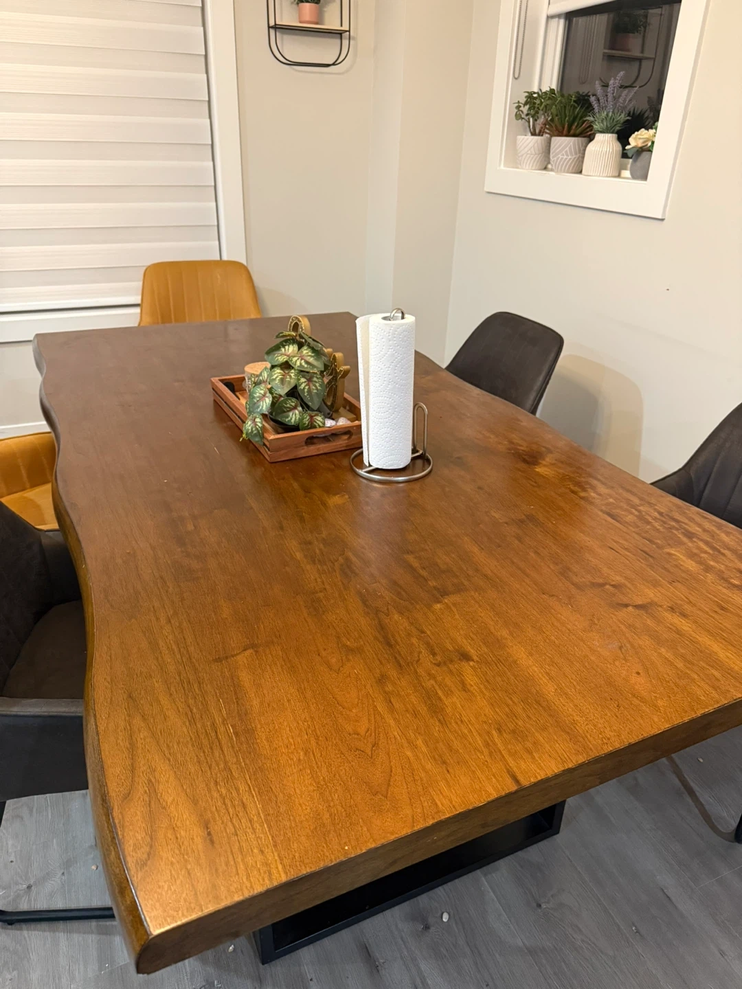 Beautiful solid wood dining table with a live edge finish. Seats six comfortably. Perfect for family dinners or hosting friends!