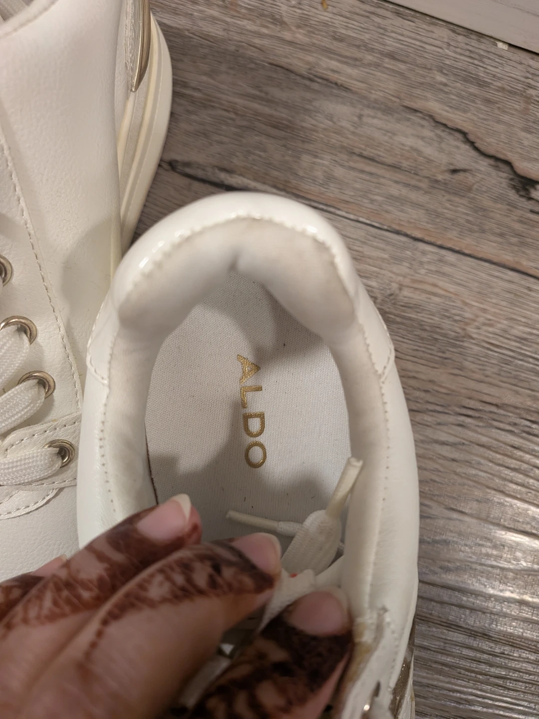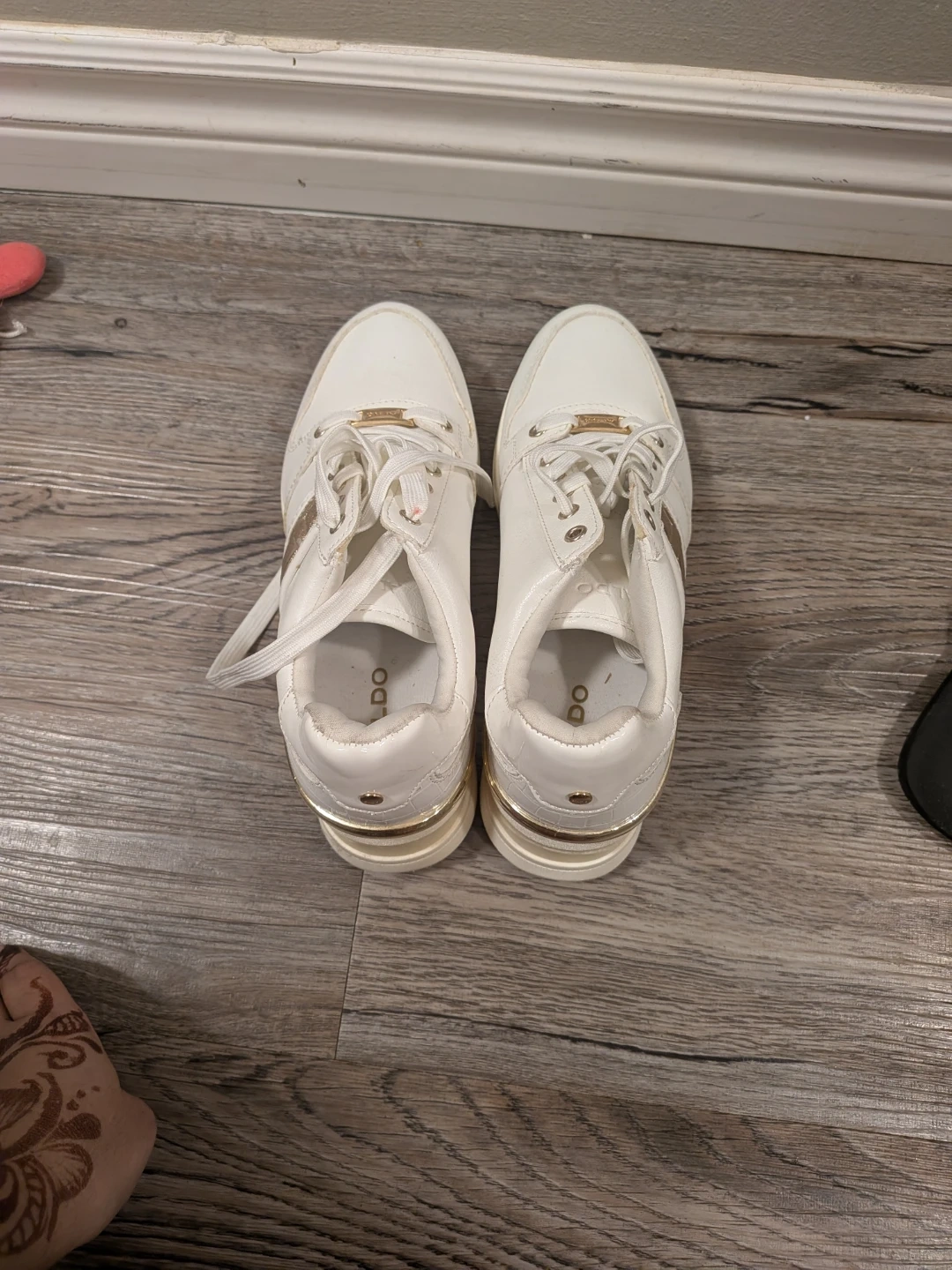 These are Aldo white sneakers with gold touch. Never wore them. Selling these because making up space as we are moving.