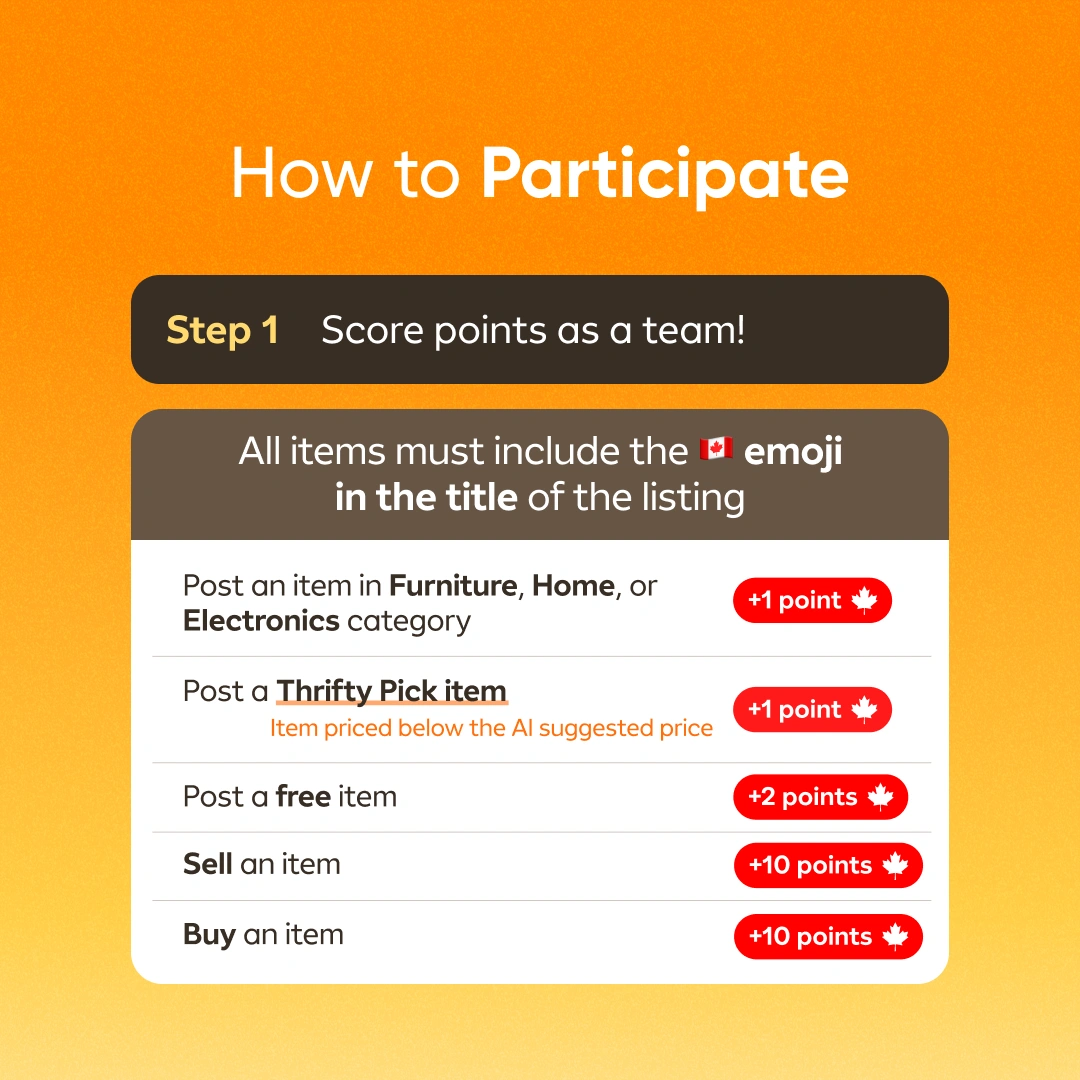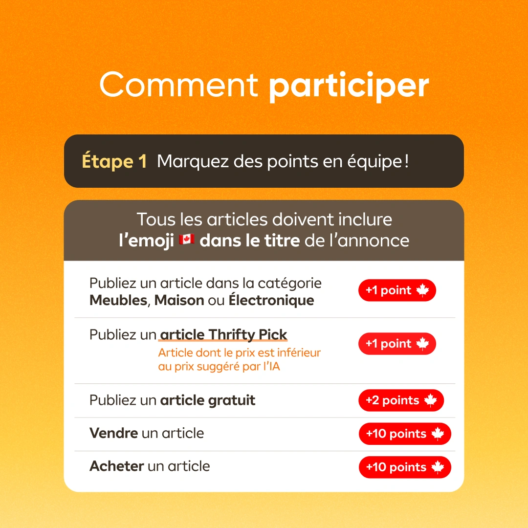 - Seules les annonces publiées, achetées ou vendues avec l’emoji 🇨🇦 dans le titre entre le 1er juillet à 00 h 00 et le 31 juillet à 23 h 59, 2025, seront comptabilisées comme des participations valides.