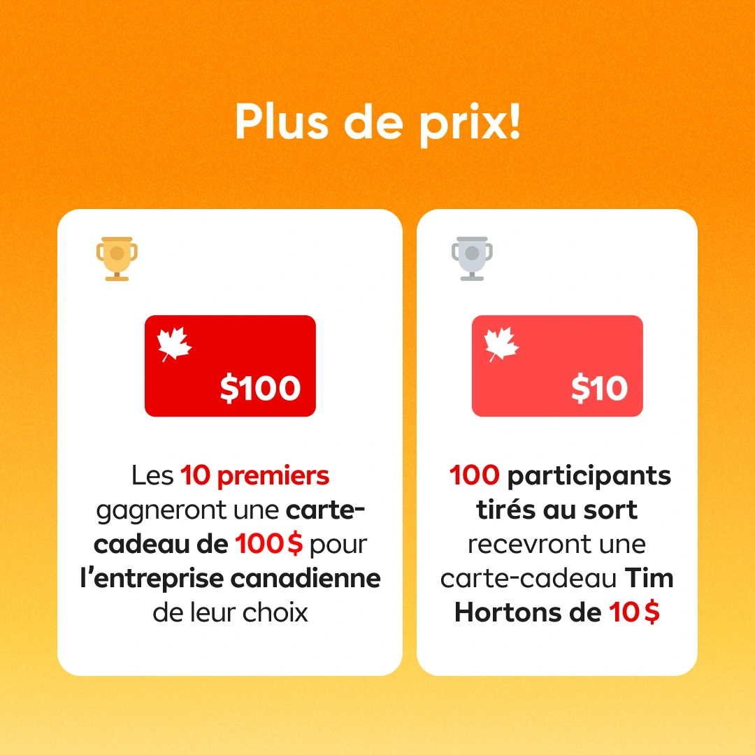 🏆 Les 10 premiers gagneront une carte-cadeau de 100 $ pour l’entreprise canadienne de leur choix.