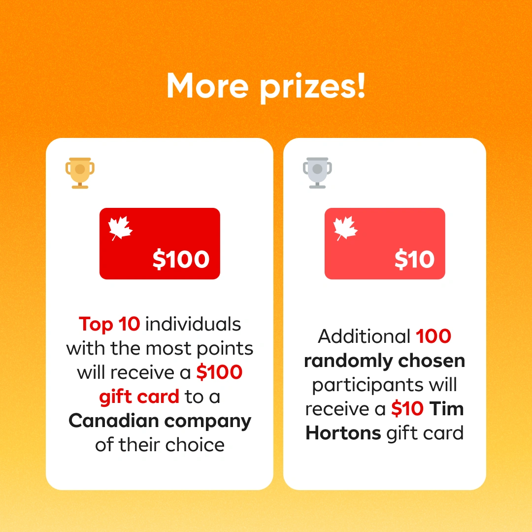 🏆 Top 10 individuals with the most points will receive a $100 gift card to a Canadian company of their choice