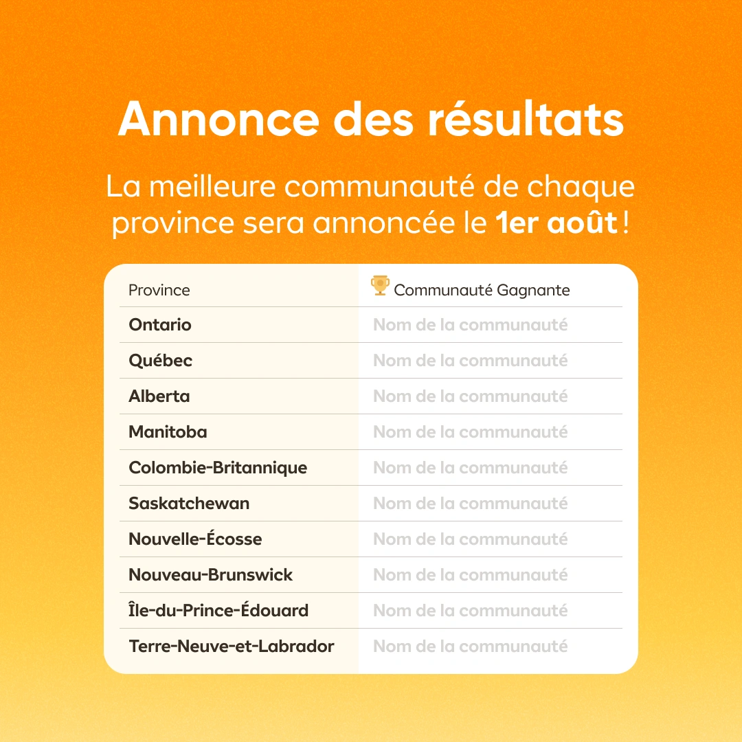 La meilleure communauté de chaque province sera annoncée le 1er août !Prêt·e à faire briller ta ville sous les projecteurs ? Que les jeux commencent ! 🇨🇦🇨🇦🇨🇦