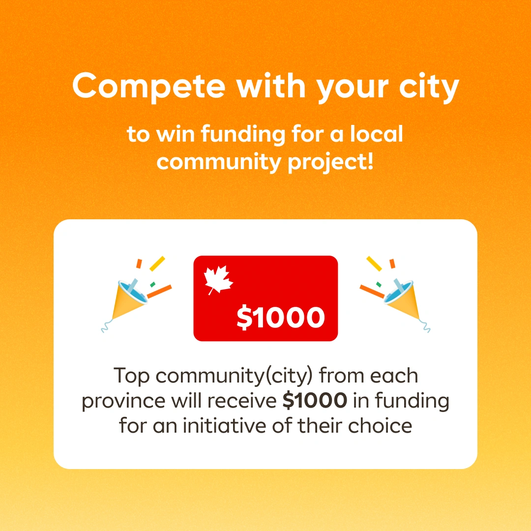 🥕Compete with your city to win funding for a local community project! Top community (city) from each province will receive $1000 in funding for an initiative of their choice.