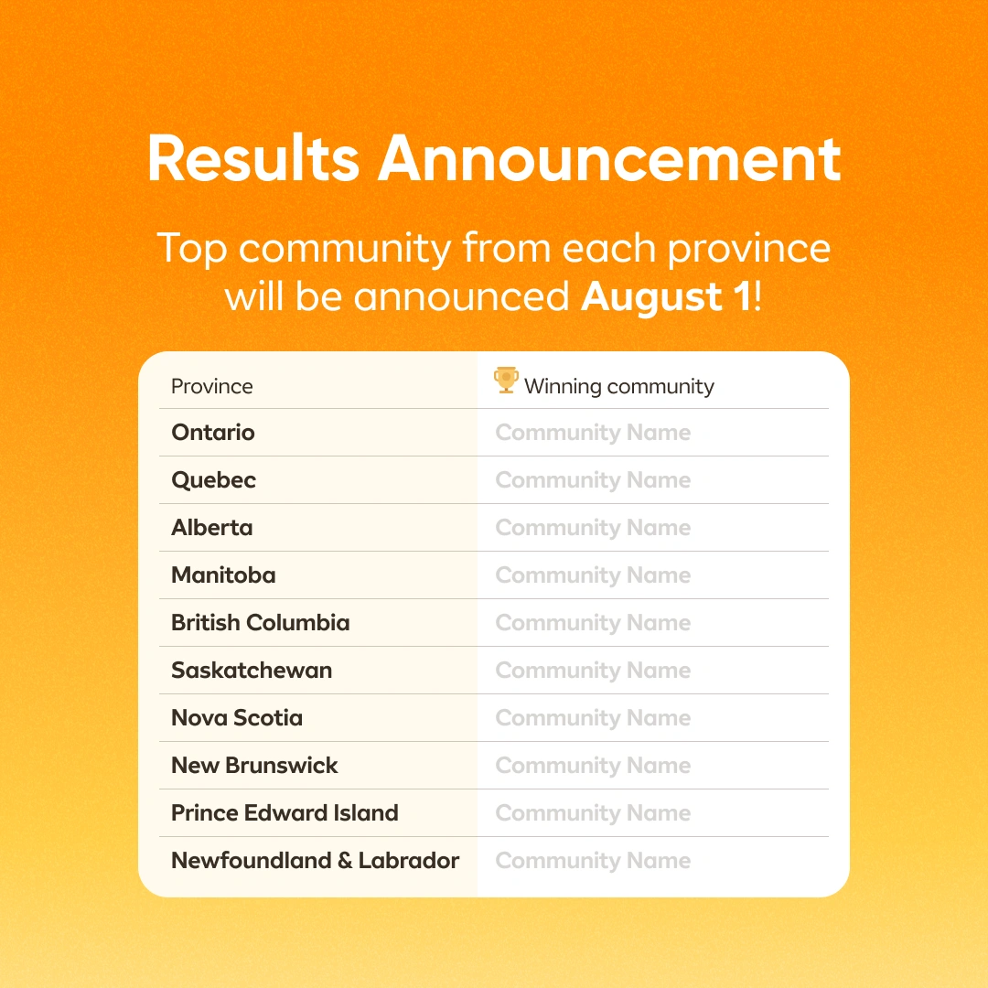 Top community from each province will be announced August 1! Ready to make your city shine in the spotlight? Let the games begin 🇨🇦🇨🇦🇨🇦