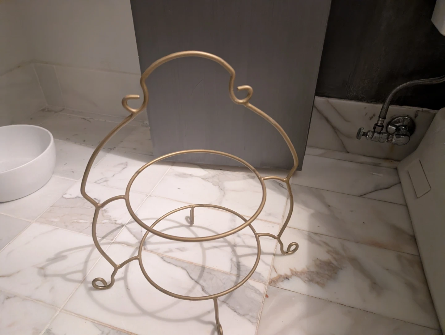 A decorative 2-tier wire display stand in a gold finish. It's made of metal wire. This stand is great for displaying small decorative items or even cupcakes!