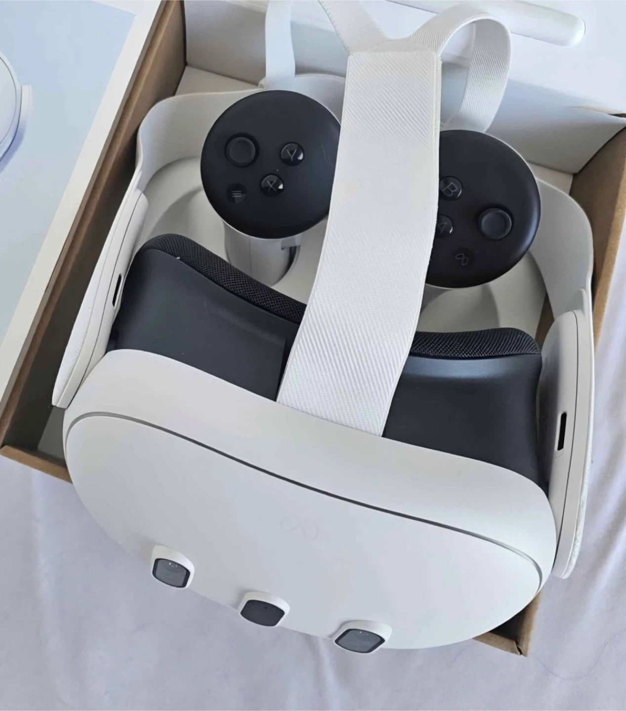 This is a white Meta Quest 3virtual reality headset with controllers. It comes with the original box. The headset has a comfortable strap for extended wear. It's great for gaming and immersive experiences!