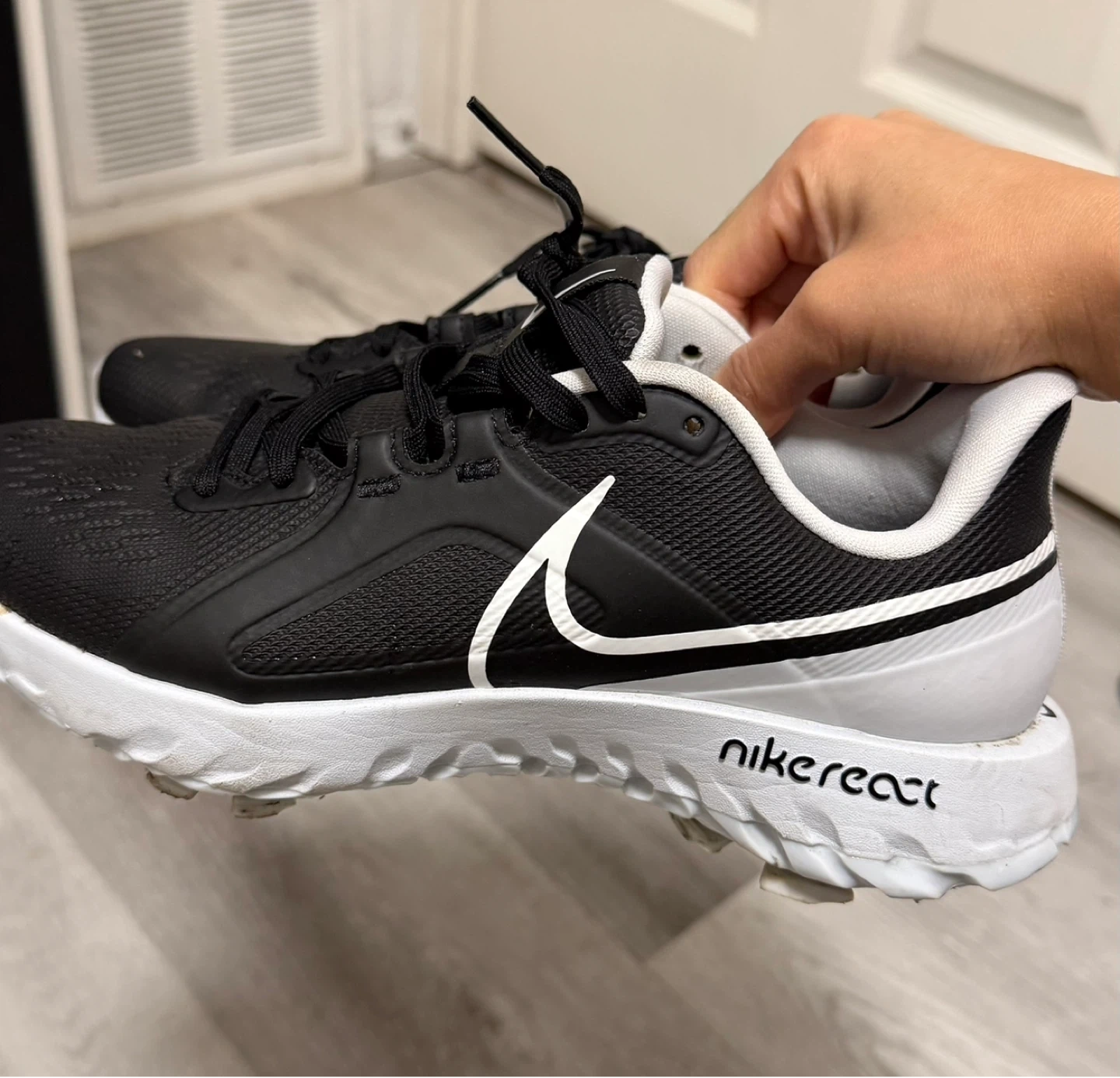 Black and white Nike React running shoes. Features a comfortable React cushioning system and a durable outsole for great traction on the course. Laces are black and the Nike swoosh is white.
