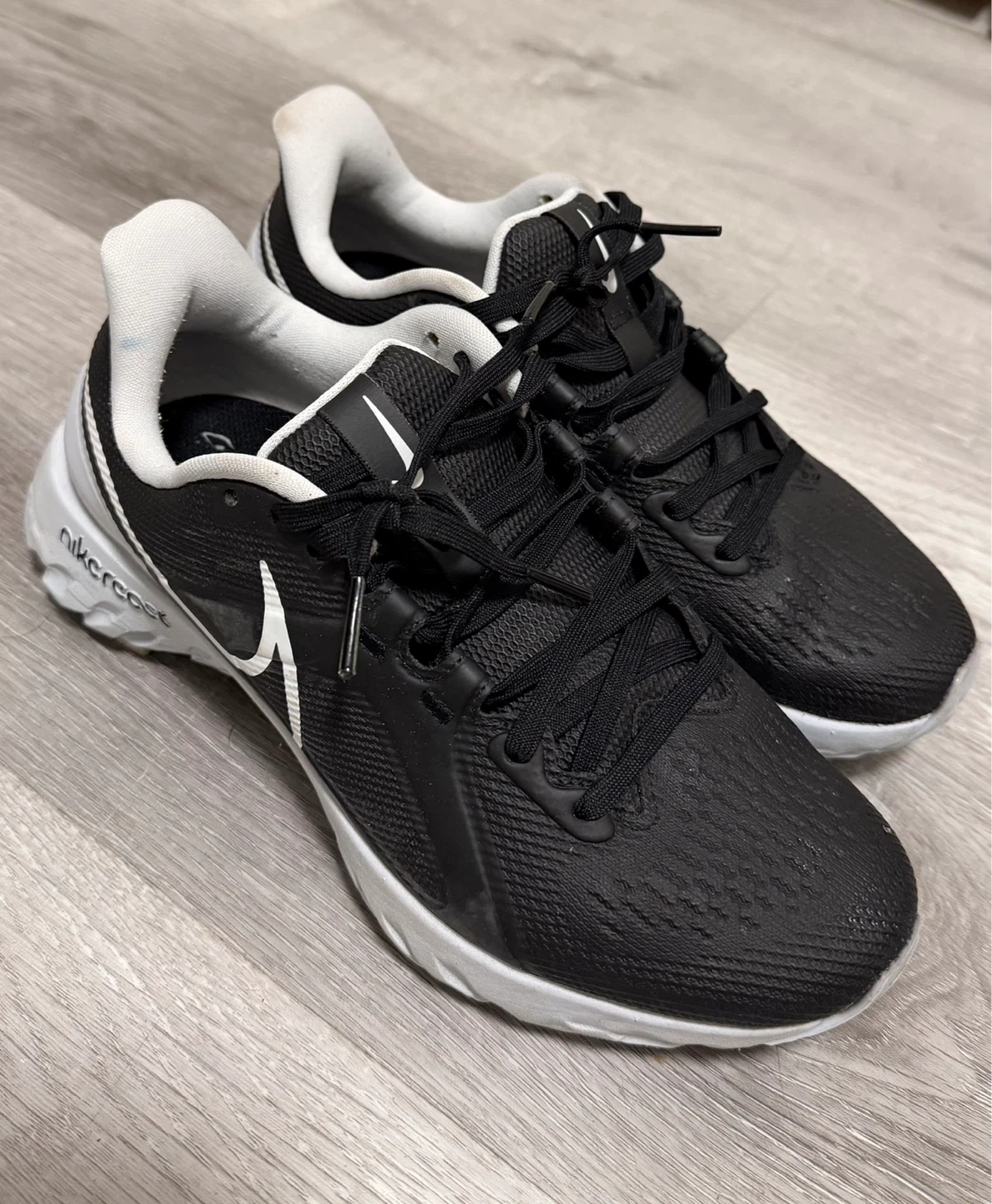 Black and white Nike React running shoes. Features a comfortable React cushioning system and a durable outsole for great traction on the course. Laces are black and the Nike swoosh is white.